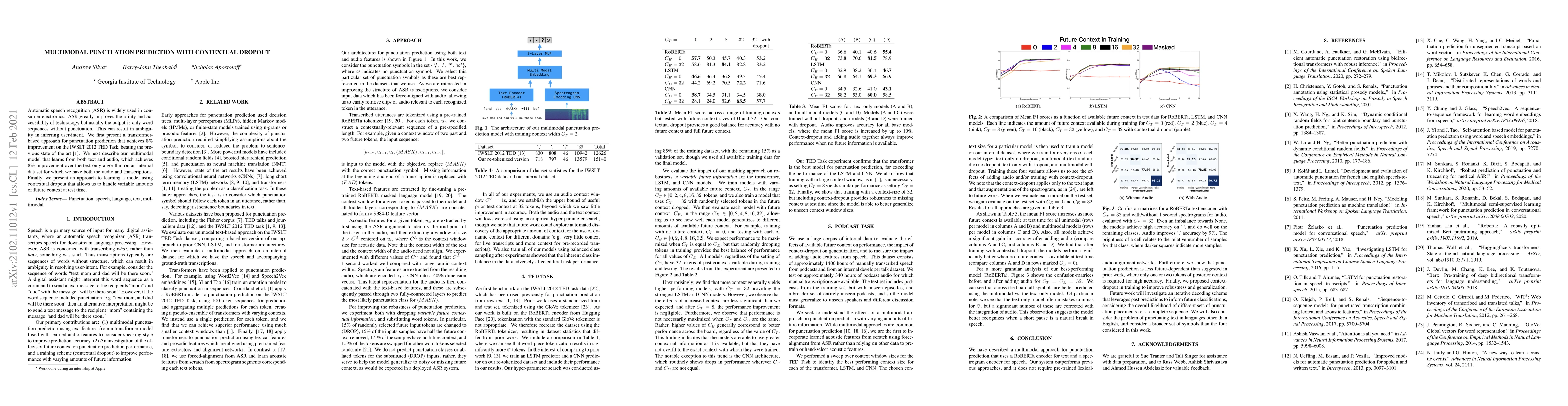 Automatic speech recognition (ASR) is widely used in consumer electronics. ASR greatly improves the utility and accessibility of technology, but usually the output is only word sequences without punctuation. This can result in ambiguity in inferring user-intent. We first present a transformer-based approach for punctuation prediction that achieves 8% improvement on the IWSLT 2012 TED Task, beating the previous state of the art [1]. We next describe our multimodal model that learns from both text and audio, which achieves 8% improvement over the text-only algorithm on an internal dataset for which we have both the audio and transcriptions. Finally, we present an approach to learning a model using contextual dropout that allows us to handle variable amounts of future context at test time.