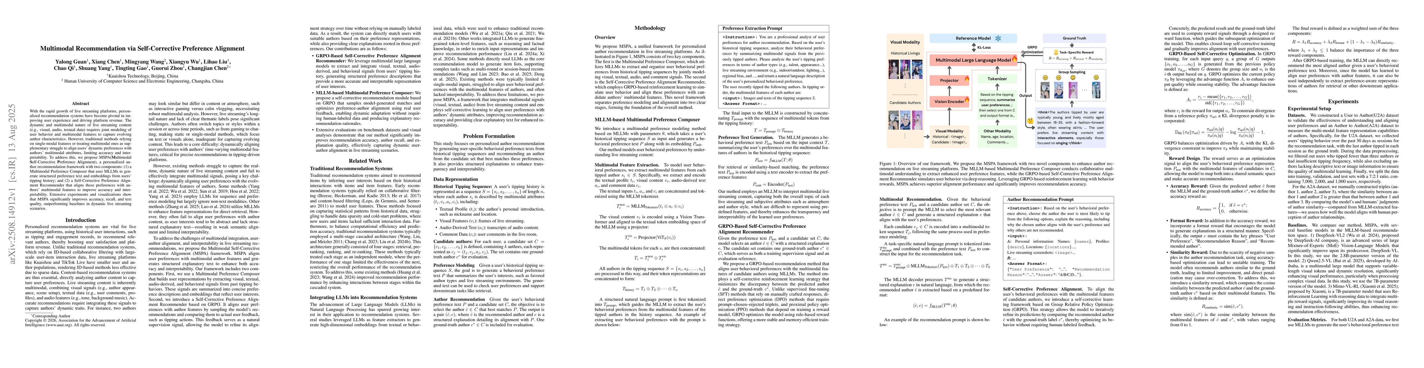 With the rapid growth of live streaming platforms, personalized recommendation systems have become pivotal in improving user experience and driving platform revenue. The dynamic and multimodal nature of live streaming content (e.g., visual, audio, textual data) requires joint modeling of user behavior and multimodal features to capture evolving author characteristics. However, traditional methods relying on single-modal features or treating multimodal ones as supplementary struggle to align users' dynamic preferences with authors' multimodal attributes, limiting accuracy and interpretability. To address this, we propose MSPA (Multimodal Self-Corrective Preference Alignment), a personalized author recommendation framework with two components: (1) a Multimodal Preference Composer that uses MLLMs to generate structured preference text and embeddings from users' tipping history; and (2) a Self-Corrective Preference Alignment Recommender that aligns these preferences with authors' multimodal features to improve accuracy and interpretability. Extensive experiments and visualizations show that MSPA significantly improves accuracy, recall, and text quality, outperforming baselines in dynamic live streaming scenarios.