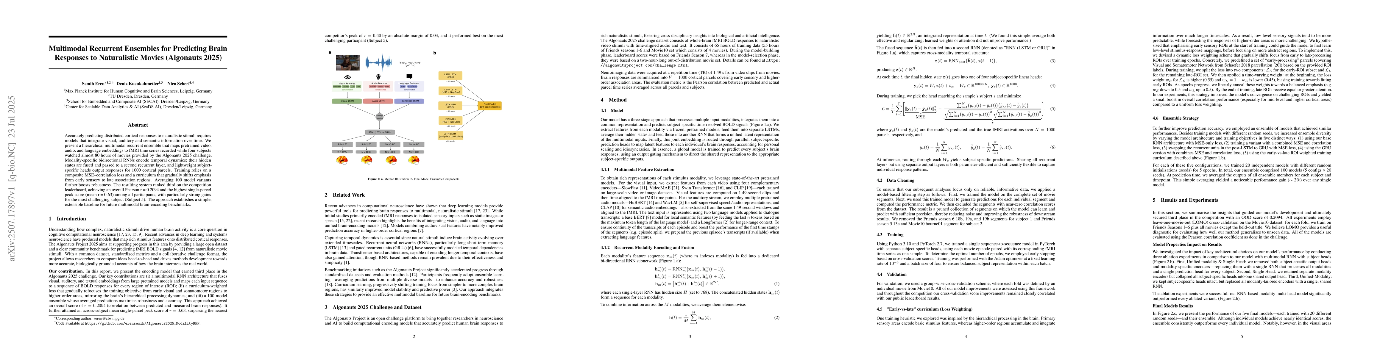 Accurately predicting distributed cortical responses to naturalistic stimuli requires models that integrate visual, auditory and semantic information over time. We present a hierarchical multimodal recurrent ensemble that maps pretrained video, audio, and language embeddings to fMRI time series recorded while four subjects watched almost 80 hours of movies provided by the Algonauts 2025 challenge. Modality-specific bidirectional RNNs encode temporal dynamics; their hidden states are fused and passed to a second recurrent layer, and lightweight subject-specific heads output responses for 1000 cortical parcels. Training relies on a composite MSE-correlation loss and a curriculum that gradually shifts emphasis from early sensory to late association regions. Averaging 100 model variants further boosts robustness. The resulting system ranked third on the competition leaderboard, achieving an overall Pearson r = 0.2094 and the highest single-parcel peak score (mean r = 0.63) among all participants, with particularly strong gains for the most challenging subject (Subject 5). The approach establishes a simple, extensible baseline for future multimodal brain-encoding benchmarks.