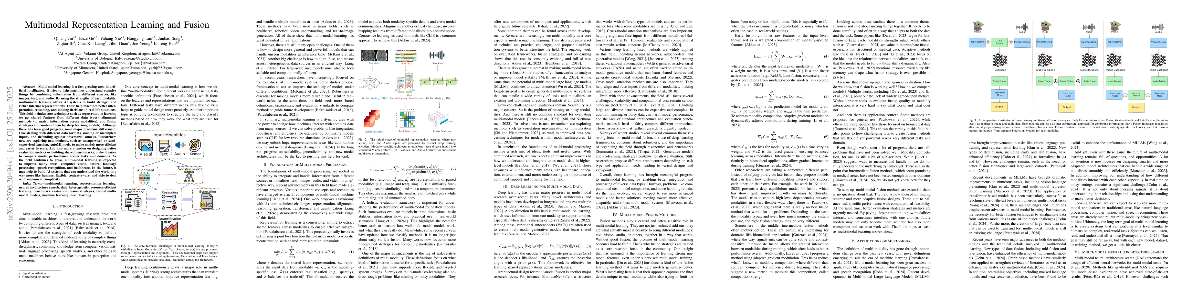 Multi-modal learning is a fast growing area in artificial intelligence. It tries to help machines understand complex things by combining information from different sources, like images, text, and audio. By using the strengths of each modality, multi-modal learning allows AI systems to build stronger and richer internal representations. These help machines better interpretation, reasoning, and making decisions in real-life situations. This field includes core techniques such as representation learning (to get shared features from different data types), alignment methods (to match information across modalities), and fusion strategies (to combine them by deep learning models). Although there has been good progress, some major problems still remain. Like dealing with different data formats, missing or incomplete inputs, and defending against adversarial attacks. Researchers now are exploring new methods, such as unsupervised or semi-supervised learning, AutoML tools, to make models more efficient and easier to scale. And also more attention on designing better evaluation metrics or building shared benchmarks, make it easier to compare model performance across tasks and domains. As the field continues to grow, multi-modal learning is expected to improve many areas: computer vision, natural language processing, speech recognition, and healthcare. In the future, it may help to build AI systems that can understand the world in a way more like humans, flexible, context aware, and able to deal with real-world complexity.