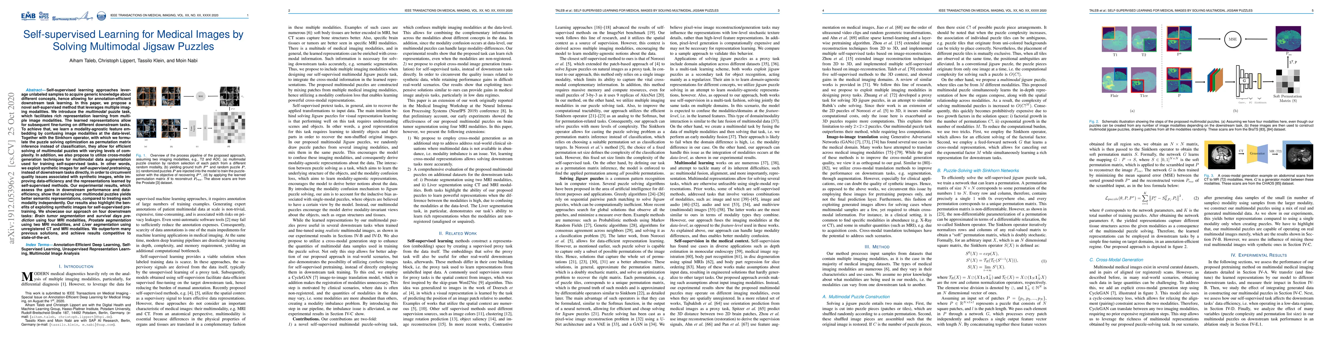 Self-supervised learning approaches leverage unlabeled samples to acquire generic knowledge about different concepts, hence allowing for annotation-efficient downstream task learning. In this paper, we propose a novel self-supervised method that leverages multiple imaging modalities. We introduce the multimodal puzzle task, which facilitates rich representation learning from multiple image modalities. The learned representations allow for subsequent fine-tuning on different downstream tasks. To achieve that, we learn a modality-agnostic feature embedding by confusing image modalities at the data-level. Together with the Sinkhorn operator, with which we formulate the puzzle solving optimization as permutation matrix inference instead of classification, they allow for efficient solving of multimodal puzzles with varying levels of complexity. In addition, we also propose to utilize cross-modal generation techniques for multimodal data augmentation used for training self-supervised tasks. In other words, we exploit synthetic images for self-supervised pretraining, instead of downstream tasks directly, in order to circumvent quality issues associated with synthetic images, while improving data-efficiency and representations quality. Our experimental results, which assess the gains in downstream performance and data-efficiency, show that solving our multimodal puzzles yields better semantic representations, compared to treating each modality independently. Our results also highlight the benefits of exploiting synthetic images for self-supervised pretraining. We showcase our approach on four downstream tasks: Brain tumor segmentation and survival days prediction using four MRI modalities, Prostate segmentation using two MRI modalities, and Liver segmentation using unregistered CT and MRI modalities. We outperform many previous solutions, and achieve results competitive to state-of-the-art.