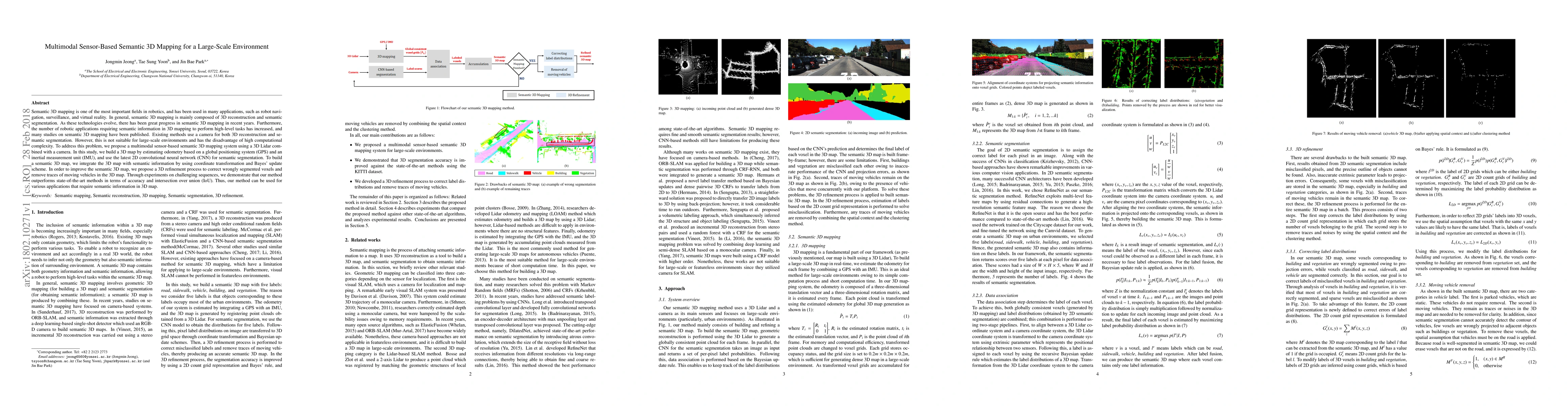 This paper proposes a multimodal sensor-based system for semantic 3D mapping using a combination of 3D Lidar and camera, addressing the limitations of single-sensor methods in large-scale environments. The system integrates 3D maps with semantic information using CNNs and a 3D refinement process, outperforming existing methods in accuracy and IoU.