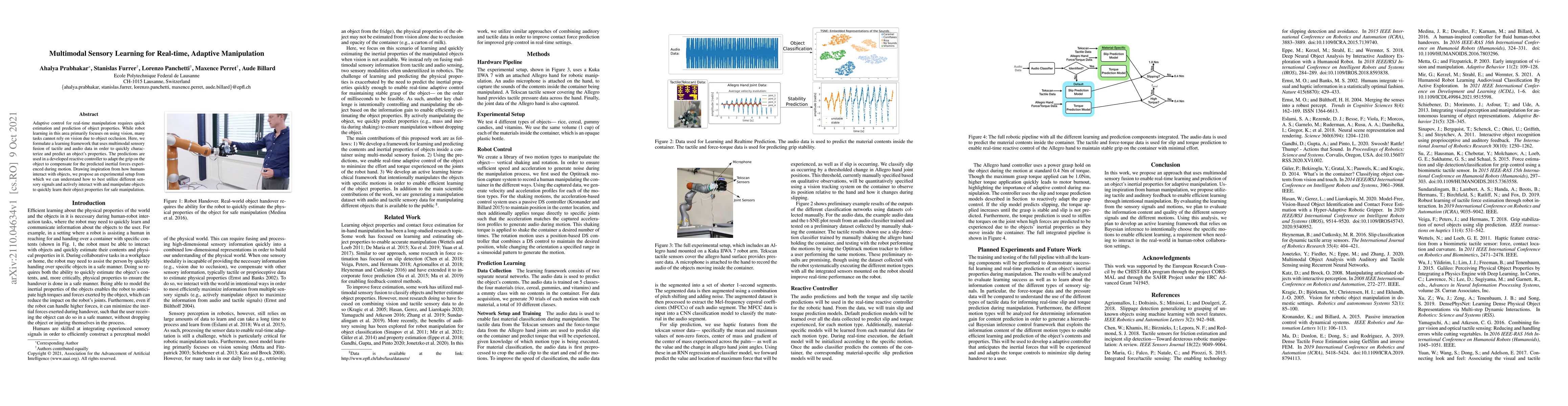 Adaptive control for real-time manipulation requires quick estimation and prediction of object properties. While robot learning in this area primarily focuses on using vision, many tasks cannot rely on vision due to object occlusion. Here, we formulate a learning framework that uses multimodal sensory fusion of tactile and audio data in order to quickly characterize and predict an object's properties. The predictions are used in a developed reactive controller to adapt the grip on the object to compensate for the predicted inertial forces experienced during motion. Drawing inspiration from how humans interact with objects, we propose an experimental setup from which we can understand how to best utilize different sensory signals and actively interact with and manipulate objects to quickly learn their object properties for safe manipulation.