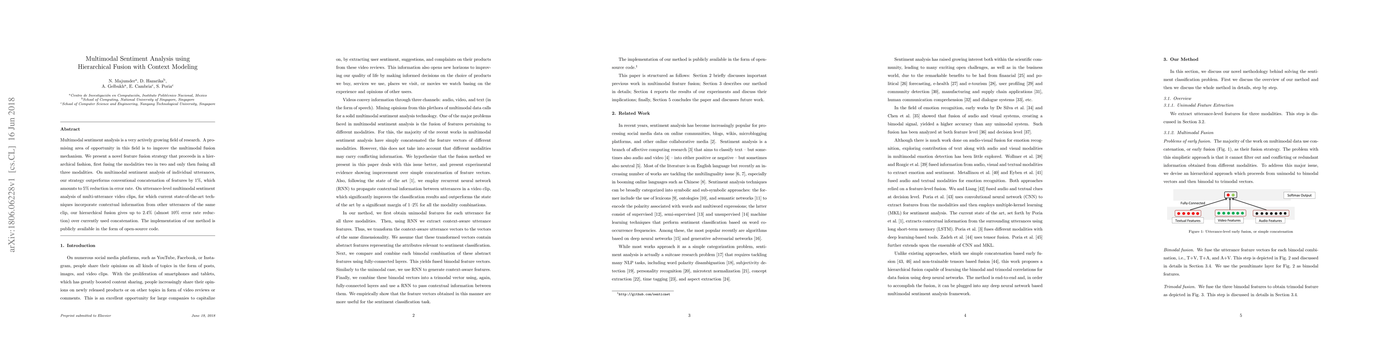 This paper proposes a hierarchical fusion strategy for multimodal sentiment analysis that first combines modalities in pairs before merging all, achieving a 1% improvement over conventional methods in individual utterances and a 2.4% improvement for multi-utterance clips, resulting in significant error rate reductions. The method is available as open-source code.