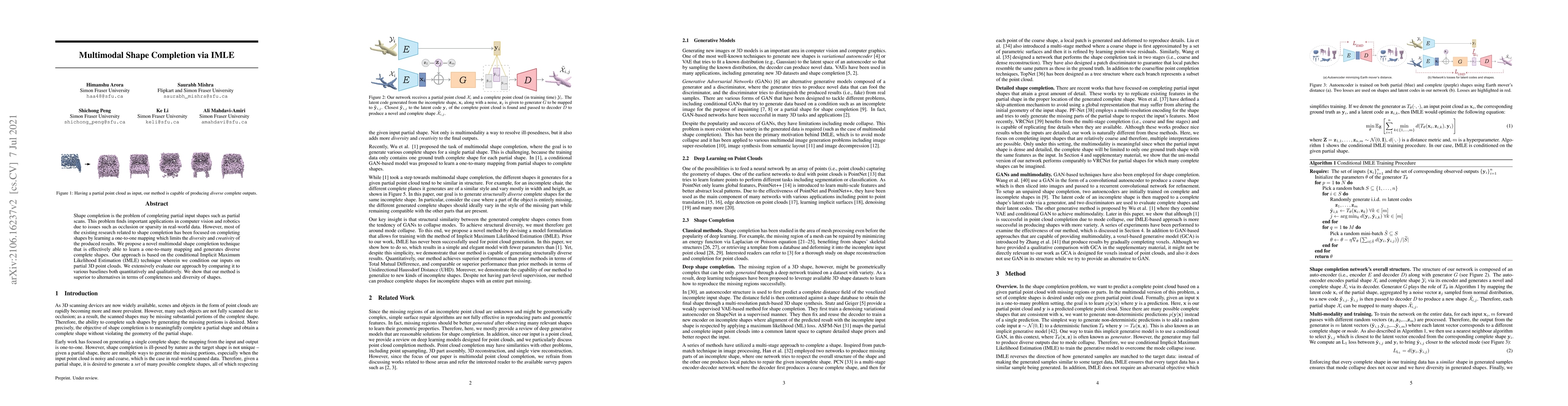 This paper proposes a novel multimodal shape completion technique using conditional Implicit MaximumLikelihood Estimation (IMLE) to generate diverse and complete shapes from partial 3D point clouds, outperforming existing one-to-one mapping methods in both completeness and diversity.