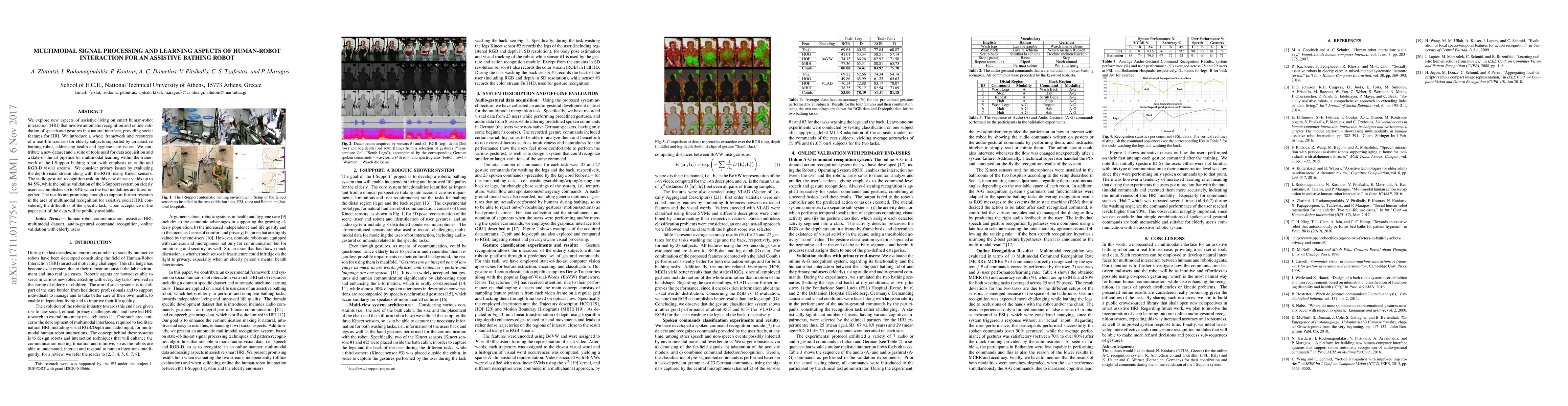 We explore new aspects of assistive living on smart human-robot interaction (HRI) that involve automatic recognition and online validation of speech and gestures in a natural interface, providing social features for HRI. We introduce a whole framework and resources of a real-life scenario for elderly subjects supported by an assistive bathing robot, addressing health and hygiene care issues. We contribute a new dataset and a suite of tools used for data acquisition and a state-of-the-art pipeline for multimodal learning within the framework of the I-Support bathing robot, with emphasis on audio and RGB-D visual streams. We consider privacy issues by evaluating the depth visual stream along with the RGB, using Kinect sensors. The audio-gestural recognition task on this new dataset yields up to 84.5%, while the online validation of the I-Support system on elderly users accomplishes up to 84% when the two modalities are fused together. The results are promising enough to support further research in the area of multimodal recognition for assistive social HRI, considering the difficulties of the specific task. Upon acceptance of the paper part of the data will be publicly available.