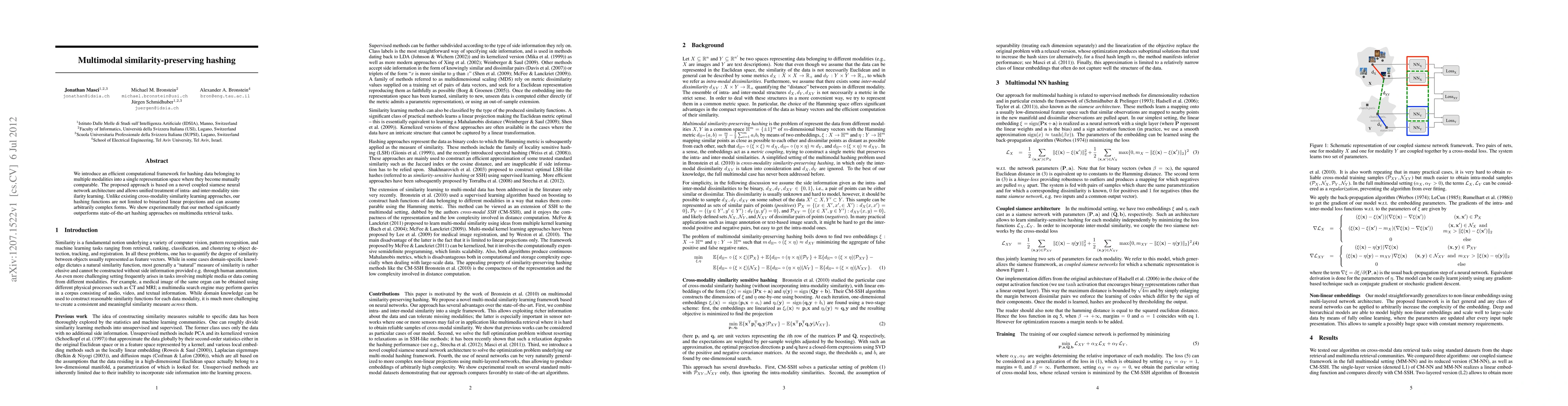 This paper proposes a novel computational framework using a coupled siamese neural network for multimodal hashing, enabling complex, non-linear representations that preserve intra- and inter-modality similarities. The method outperforms existing approaches in multimedia retrieval tasks.