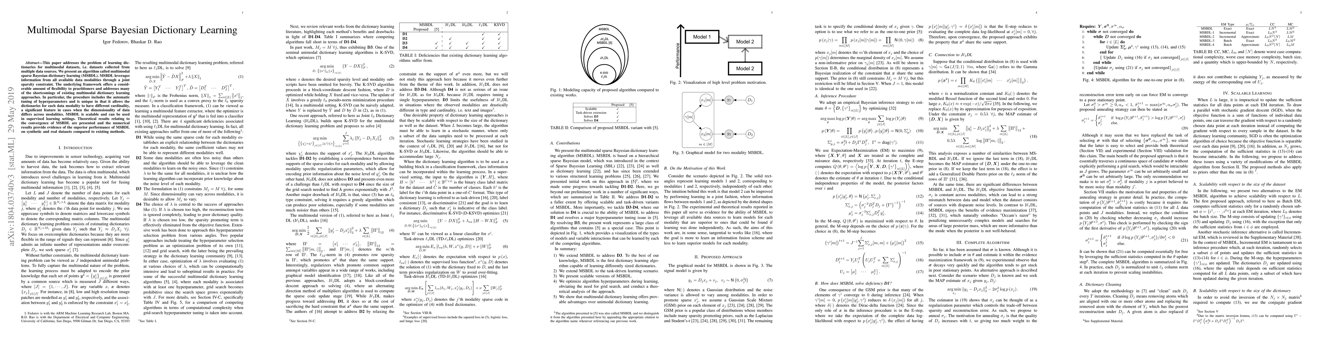 This paper addresses the problem of learning dictionaries for multimodal datasets, i.e. datasets collected from multiple data sources. We present an algorithm called multimodal sparse Bayesian dictionary learning (MSBDL). MSBDL leverages information from all available data modalities through a joint sparsity constraint. The underlying framework offers a considerable amount of flexibility to practitioners and addresses many of the shortcomings of existing multimodal dictionary learning approaches. In particular, the procedure includes the automatic tuning of hyperparameters and is unique in that it allows the dictionaries for each data modality to have different cardinality, a significant feature in cases when the dimensionality of data differs across modalities. MSBDL is scalable and can be used in supervised learning settings. Theoretical results relating to the convergence of MSBDL are presented and the numerical results provide evidence of the superior performance of MSBDL on synthetic and real datasets compared to existing methods.