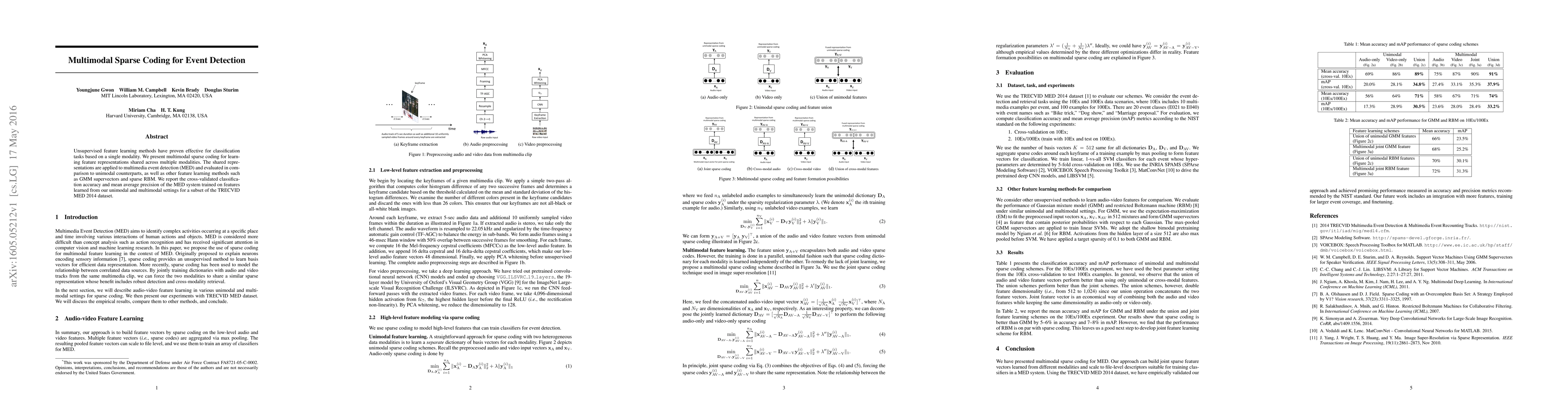 This research paper introduces multimodal sparse coding for event detection, a method that learns shared feature representations across multiple modalities to improve classification accuracy in multimedia event detection. The results show improved performance compared to unimodal methods and other feature learning techniques.