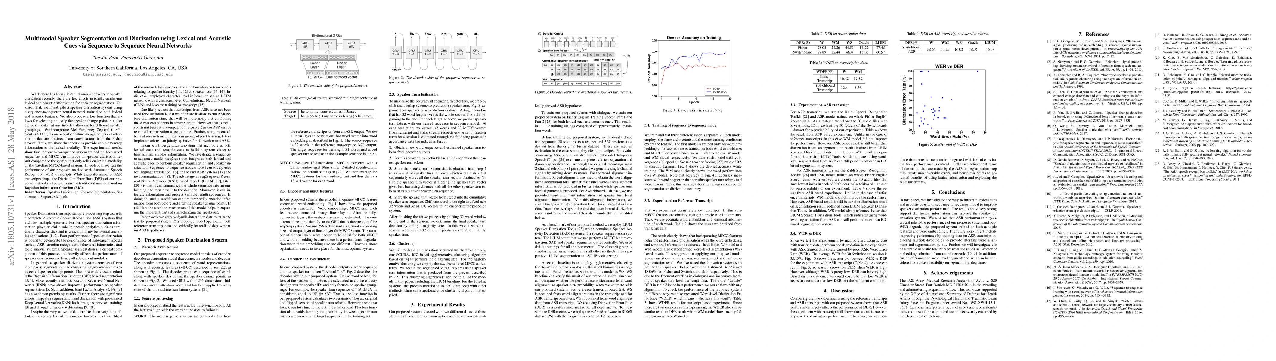 This paper proposes a multimodal speaker diarization system using sequence-to-sequence neural networks that integrate lexical and acoustic cues, showing improved performance over systems relying solely on lexical or acoustic features. The method also introduces a novel loss function for better speaker change detection and grouping.