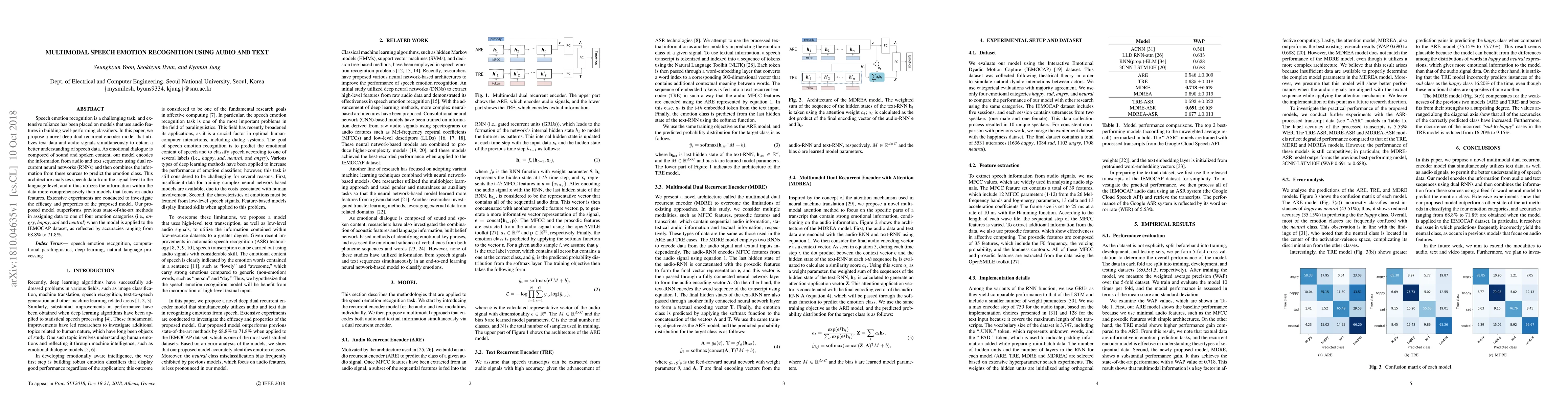 Speech emotion recognition is a challenging task, and extensive reliance has been placed on models that use audio features in building well-performing classifiers. In this paper, we propose a novel deep dual recurrent encoder model that utilizes text data and audio signals simultaneously to obtain a better understanding of speech data. As emotional dialogue is composed of sound and spoken content, our model encodes the information from audio and text sequences using dual recurrent neural networks (RNNs) and then combines the information from these sources to predict the emotion class. This architecture analyzes speech data from the signal level to the language level, and it thus utilizes the information within the data more comprehensively than models that focus on audio features. Extensive experiments are conducted to investigate the efficacy and properties of the proposed model. Our proposed model outperforms previous state-of-the-art methods in assigning data to one of four emotion categories (i.e., angry, happy, sad and neutral) when the model is applied to the IEMOCAP dataset, as reflected by accuracies ranging from 68.8% to 71.8%.