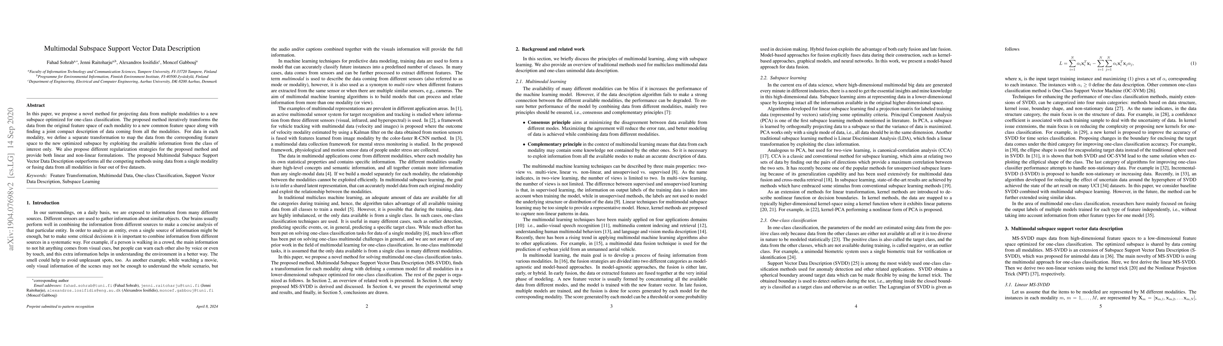 This paper introduces a novel method for projecting multimodal data into a subspace optimized for one-class classification, achieving a joint compact representation across different modalities. The method outperforms competing approaches in most datasets tested.