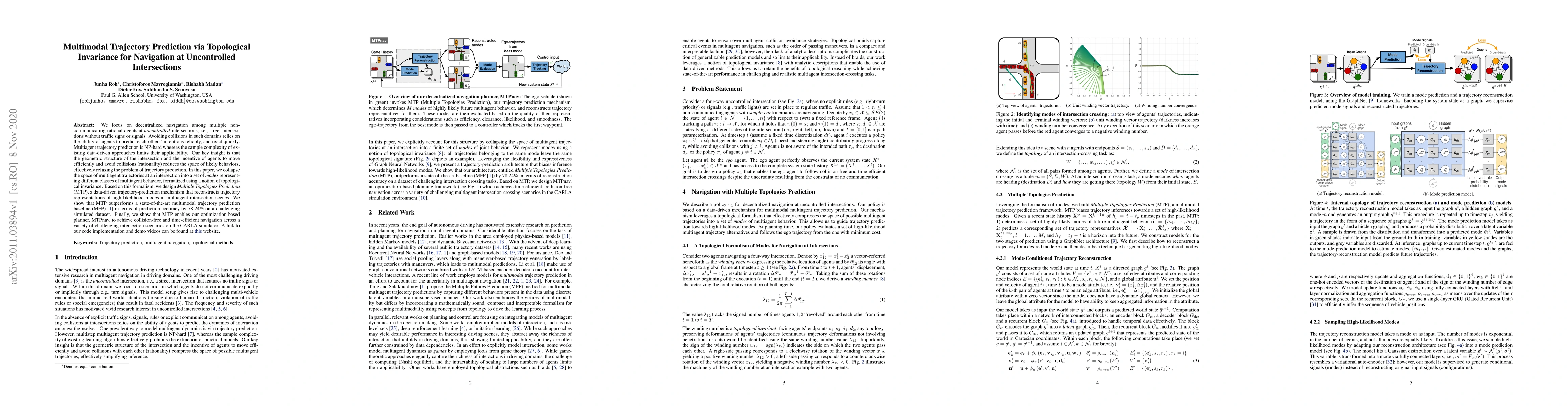 We focus on decentralized navigation among multiple non-communicating rational agents at \emph{uncontrolled} intersections, i.e., street intersections without traffic signs or signals. Avoiding collisions in such domains relies on the ability of agents to predict each others' intentions reliably, and react quickly. Multiagent trajectory prediction is NP-hard whereas the sample complexity of existing data-driven approaches limits their applicability. Our key insight is that the geometric structure of the intersection and the incentive of agents to move efficiently and avoid collisions (rationality) reduces the space of likely behaviors, effectively relaxing the problem of trajectory prediction. In this paper, we collapse the space of multiagent trajectories at an intersection into a set of modes representing different classes of multiagent behavior, formalized using a notion of topological invariance. Based on this formalism, we design Multiple Topologies Prediction (MTP), a data-driven trajectory-prediction mechanism that reconstructs trajectory representations of high-likelihood modes in multiagent intersection scenes. We show that MTP outperforms a state-of-the-art multimodal trajectory prediction baseline (MFP) in terms of prediction accuracy by 78.24% on a challenging simulated dataset. Finally, we show that MTP enables our optimization-based planner, MTPnav, to achieve collision-free and time-efficient navigation across a variety of challenging intersection scenarios on the CARLA simulator.