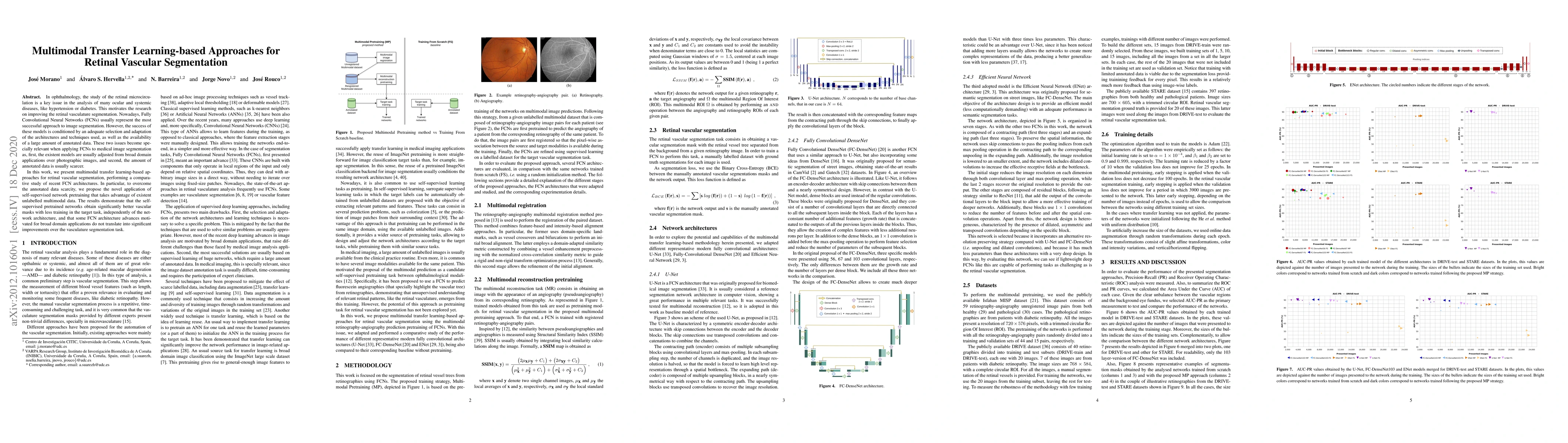 In ophthalmology, the study of the retinal microcirculation is a key issue in the analysis of many ocular and systemic diseases, like hypertension or diabetes. This motivates the research on improving the retinal vasculature segmentation. Nowadays, Fully Convolutional Neural Networks (FCNs) usually represent the most successful approach to image segmentation. However, the success of these models is conditioned by an adequate selection and adaptation of the architectures and techniques used, as well as the availability of a large amount of annotated data. These two issues become specially relevant when applying FCNs to medical image segmentation as, first, the existent models are usually adjusted from broad domain applications over photographic images, and second, the amount of annotated data is usually scarcer. In this work, we present multimodal transfer learning-based approaches for retinal vascular segmentation, performing a comparative study of recent FCN architectures. In particular, to overcome the annotated data scarcity, we propose the novel application of self-supervised network pretraining that takes advantage of existent unlabelled multimodal data. The results demonstrate that the self-supervised pretrained networks obtain significantly better vascular masks with less training in the target task, independently of the network architecture, and that some FCN architecture advances motivated for broad domain applications do not translate into significant improvements over the vasculature segmentation task.