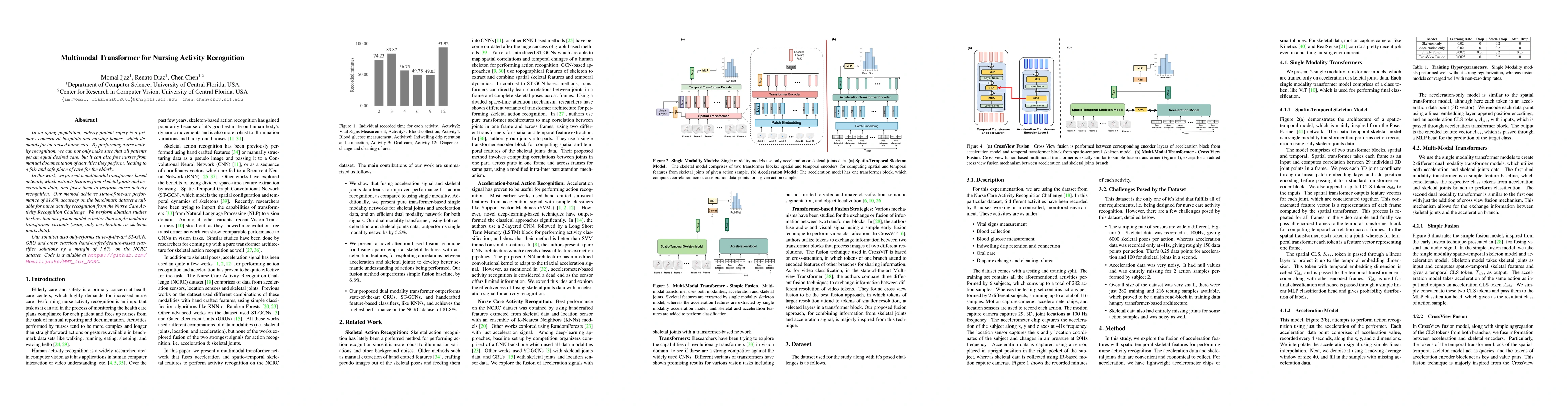 This research proposes a multimodal transformer network for recognizing nursing activities using skeletal joints and acceleration data, achieving 81.8% accuracy. The method outperforms single modality approaches and other state-of-the-art models, enhancing patient safety and reducing nurse workload.