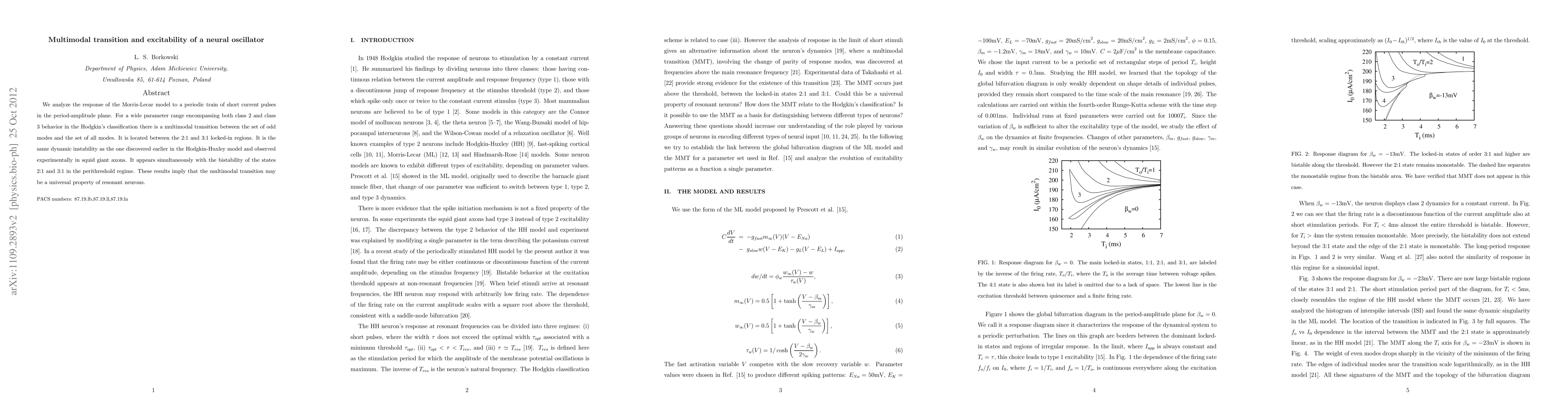 This paper investigates the Morris-Lecar model's response to periodic current pulses, revealing a multimodal transition between different oscillation modes, akin to dynamic instability found in the Hodgkin-Huxley model. The transition occurs between 2:1 and 3:1 locked-in regions, suggesting it may be a universal property of resonant neurons.