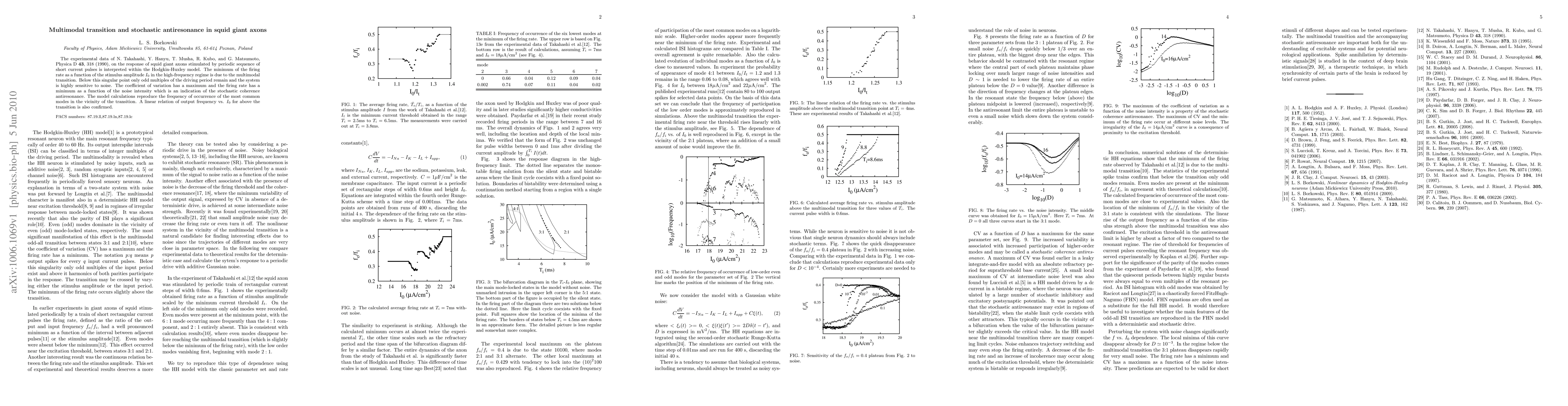 The experimental data of N. Takahashi, Y. Hanyu, T. Musha, R. Kubo, and G. Matsumoto, Physica D \textbf{43}, 318 (1990), on the response of squid giant axons stimulated by periodic sequence of short current pulses is interpreted within the Hodgkin-Huxley model. The minimum of the firing rate as a function of the stimulus amplitude $I_0$ in the high-frequency regime is due to the multimodal transition. Below this singular point only odd multiples of the driving period remain and the system is highly sensitive to noise. The coefficient of variation has a maximum and the firing rate has a minimum as a function of the noise intensity which is an indication of the stochastic coherence antiresonance. The model calculations reproduce the frequency of occurrence of the most common modes in the vicinity of the transition. A linear relation of output frequency vs. $I_0$ for above the transition is also confirmed.
