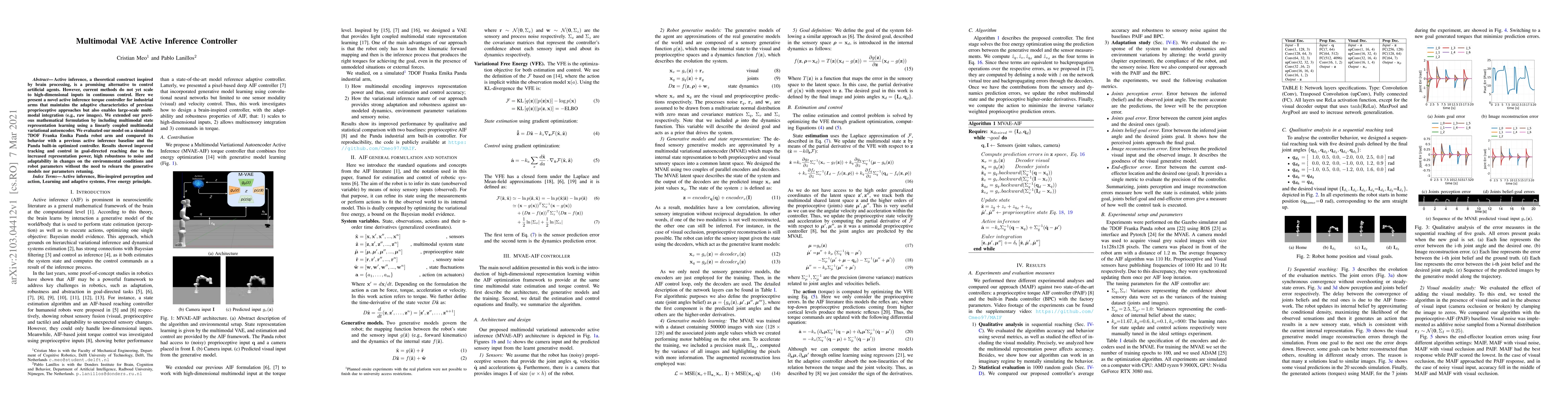 Active inference, a theoretical construct inspired by brain processing, is a promising alternative to control artificial agents. However, current methods do not yet scale to high-dimensional inputs in continuous control. Here we present a novel active inference torque controller for industrial arms that maintains the adaptive characteristics of previous proprioceptive approaches but also enables large-scale multimodal integration (e.g., raw images). We extended our previous mathematical formulation by including multimodal state representation learning using a linearly coupled multimodal variational autoencoder. We evaluated our model on a simulated 7DOF Franka Emika Panda robot arm and compared its behavior with a previous active inference baseline and the Panda built-in optimized controller. Results showed improved tracking and control in goal-directed reaching due to the increased representation power, high robustness to noise and adaptability in changes on the environmental conditions and robot parameters without the need to relearn the generative models nor parameters retuning.