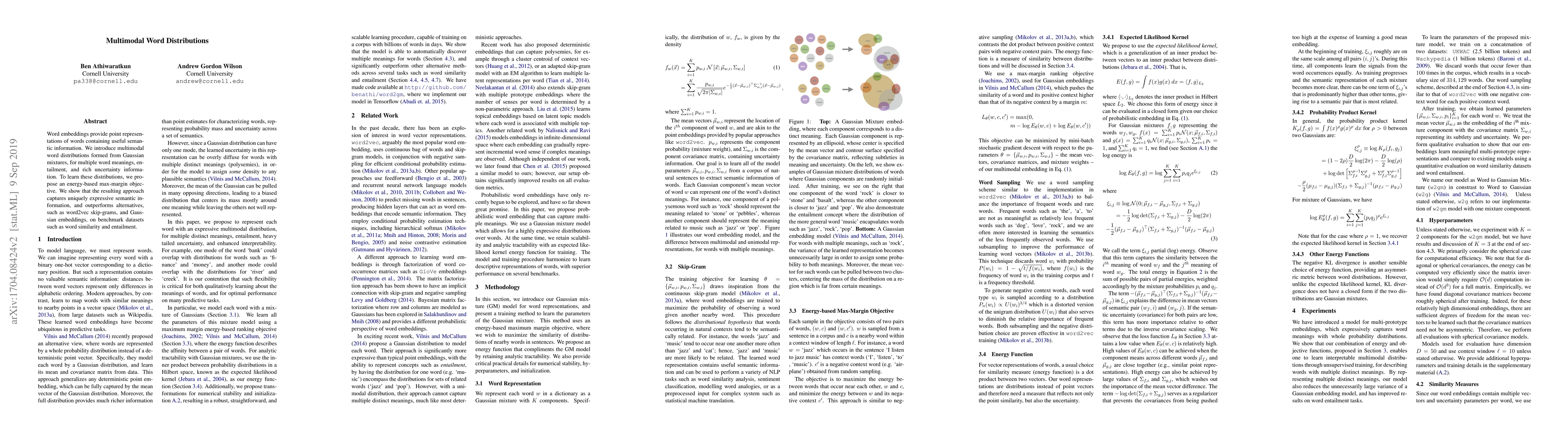 This paper introduces multimodal word distributions using Gaussian mixtures to capture multiple word meanings and semantic information. An energy-based max-margin objective is proposed to learn these distributions, which outperform traditional word embeddings on word similarity and entailment tasks.