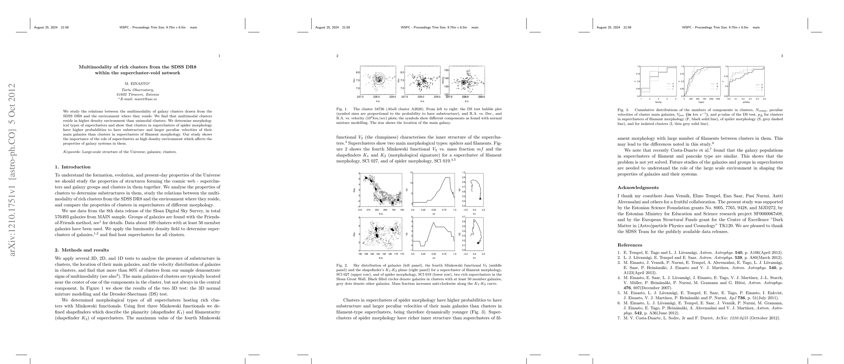 We study the relations between the multimodality of galaxy clusters drawn from the SDSS DR8 and the environment where they reside. We find that multimodal clusters reside in higher density environment than unimodal clusters. We determine morphological types of superclusters and show that clusters in superclusters of spider morphology have higher probabilities to have substructure and larger peculiar velocities of their main galaxies than clusters in superclusters of filament morphology. Our study shows the importance of the role of superclusters as high density environment which affects the properties of galaxy systems in them.
