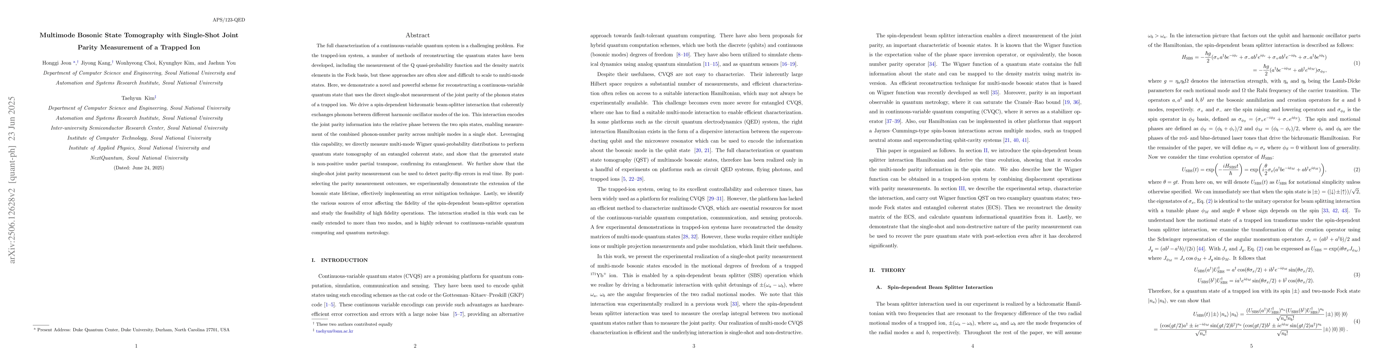 The full characterization of a continuous-variable quantum system is a challenging problem. For the trapped-ion system, a number of methods of reconstructing the quantum states have been developed, including the measurement of the Q quasi-probability function and the density matrix elements in the Fock basis, but these approaches are often slow and difficult to scale to multi-mode states. Here, we demonstrate a novel and powerful scheme for reconstructing a continuous-variable quantum state that uses the direct single-shot measurement of the joint parity of the phonon states of a trapped ion. We drive a spin-dependent bichromatic beam-splitter interaction that coherently exchanges phonons between different harmonic oscillator modes of the ion. This interaction encodes the joint parity information into the relative phase between the two spin states, enabling measurement of the combined phonon-number parity across multiple modes in a single shot. Leveraging this capability, we directly measure multi-mode Wigner quasi-probability distributions to perform quantum state tomography of an entangled coherent state, and show that the generated state is non-positive under partial transpose, confirming its entanglement. We further show that the single-shot joint parity measurement can be used to detect parity-flip errors in real time. By post-selecting the parity measurement outcomes, we experimentally demonstrate the extension of the bosonic state lifetime, effectively implementing an error mitigation technique. Lastly, we identify the various sources of error affecting the fidelity of the spin-dependent beam-splitter operation and study the feasibility of high fidelity operations. The interaction studied in this work can be easily extended to more than two modes, and is highly relevant to continuous-variable quantum computing and quantum metrology.