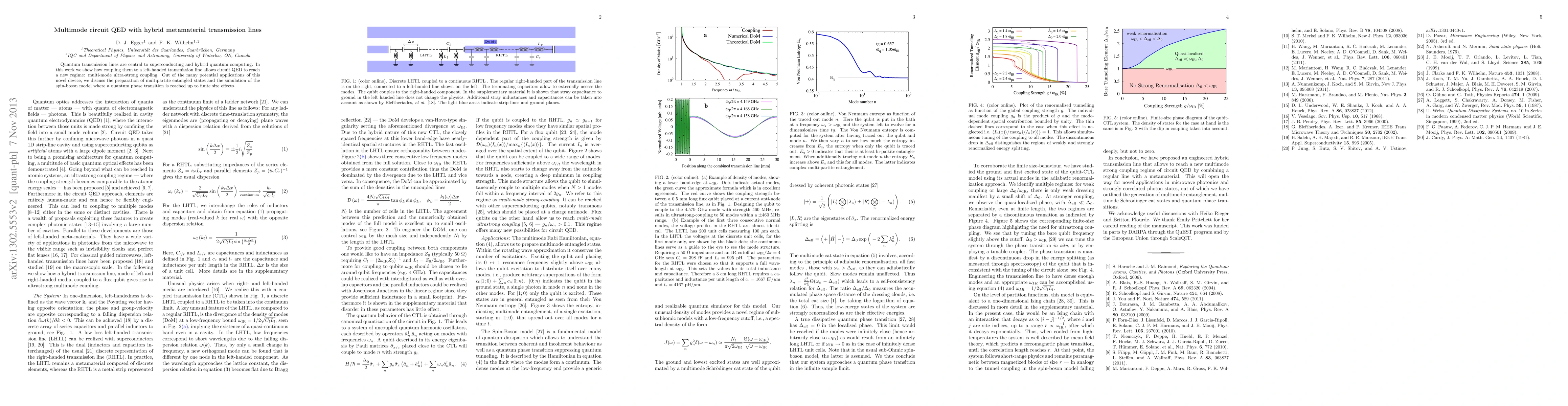Quantum transmission lines are a central to superconducting and hybrid quantum computing. Parallel to these developments are those of left-handed meta-materials. They have a wide variety of applications in photonics from the microwave to the visible range such as invisibility cloaks and perfect flat lenses. For classical guided microwaves, left-handed transmission lines have been proposed and studied on the macroscopic scale. We combine these ideas in presenting a left-handed/right-handed hybrid transmission line for applications in quantum optics on a chip. The resulting system allows circuit QED to reach a new regime: multi-mode ultra-strong coupling. Out of the many potential applications of this novel device, we discuss two; the preparation of multipartite entangled states and its use as a quantum simulator for the spin-boson model where a quantum phase transition is reached up to finite size-effects.