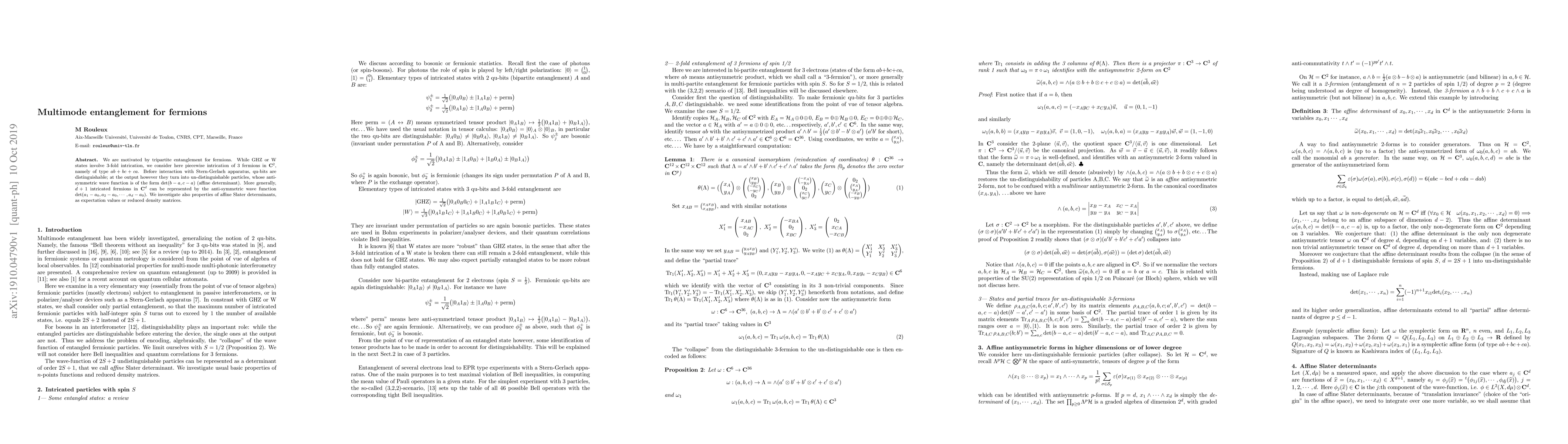 We are motivated by tripartite entanglement for fermions. While GHZ or W states involve 3-fold intrication, we consider here piecewise intrication of 3 fermions in ${\bf C}^2$, namely of type $ab+bc+ca$. Before interaction with Stern-Gerlach apparatus, qu-bits are distinguishable; at the output however they turn into un-distinguishable particles, whose anti-symmetric wave function is of the form $\det(b-a,c-a)$ (affine determinant). More generally, $d+1$ intricated fermions in ${\bf C}^d$ can be represented by the anti-symmetric wave function $\det(a_1-a_0,a_2-a_0,\cdots,a_d-a_0)$. We investigate also properties of affine Slater determinants, as expectation values or reduced density matrices.