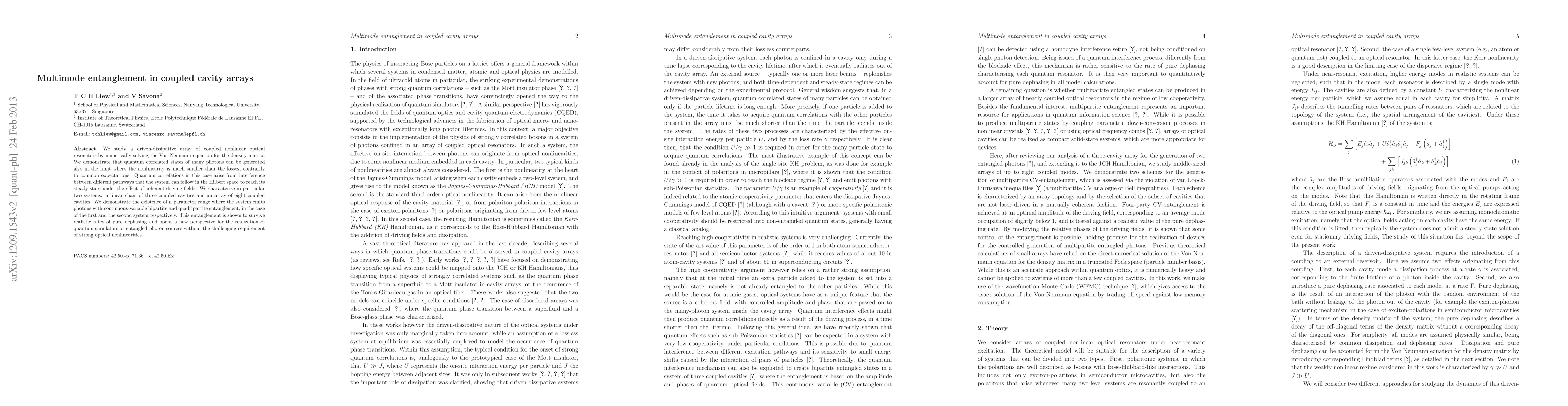 We study a driven-dissipative array of coupled nonlinear optical resonators by numerically solving the Von Neumann equation for the density matrix. We demonstrate that quantum correlated states of many photons can be generated also in the limit where the nonlinearity is much smaller than the losses, contrarily to common expectations. Quantum correlations in this case arise from interference between different pathways that the system can follow in the Hilbert space to reach its steady state under the effect of coherent driving fields. We characterize in particular two systems: a linear chain of three coupled cavities and an array of eight coupled cavities. We demonstrate the existence of a parameter range where the system emits photons with continuous-variable bipartite and quadripartite entanglement, in the case of the first and the second system respectively. This entanglement is shown to survive realistic rates of pure dephasing and opens a new perspective for the realization of quantum simulators or entangled photon sources without the challenging requirement of strong optical nonlinearities.