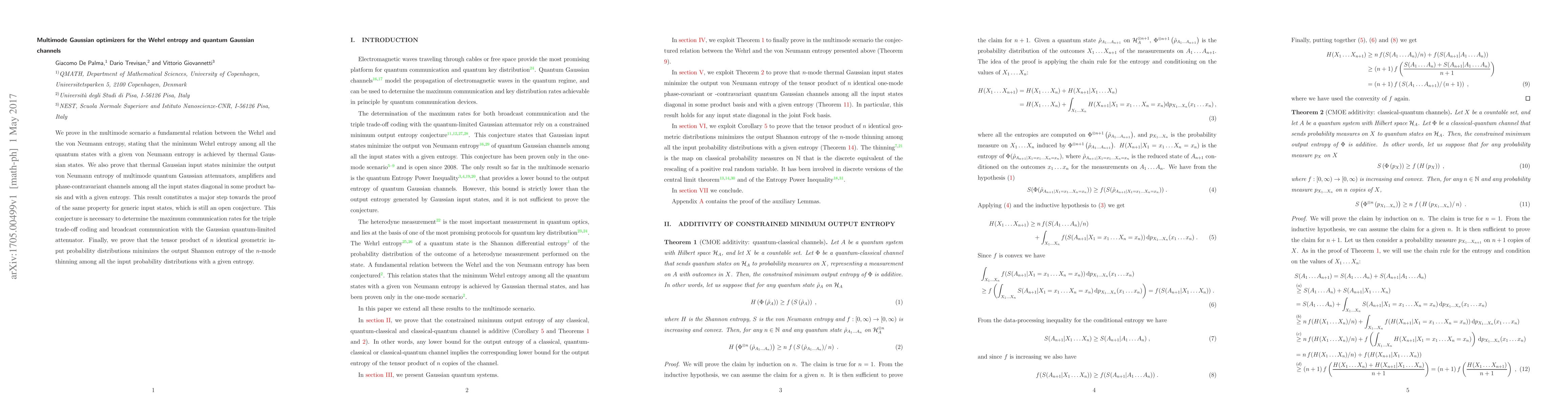 This paper establishes that thermal Gaussian states minimize both Wehrl and von Neumann entropies for multimode quantum Gaussian channels, supporting an open conjecture crucial for determining maximum communication rates in Gaussian quantum-limited systems. Additionally, it proves that tensor products of identical geometric distributions minimize output Shannon entropy for n-mode thinning.