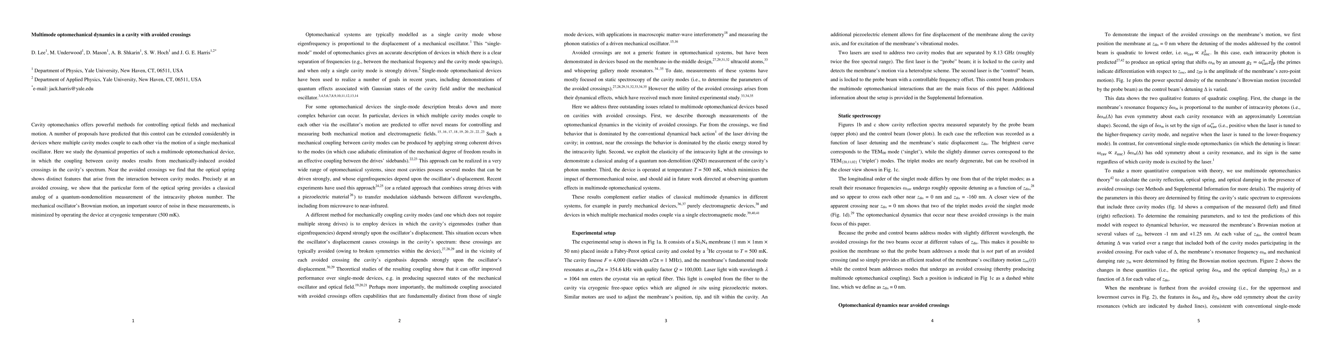 This paper investigates the dynamics of a multimode optomechanical device where multiple cavity modes interact via a single mechanical oscillator, leading to mechanically-induced avoided crossings. It reveals unique optical spring behavior near these crossings and demonstrates a classical analogy to quantum-nondemolition photon number measurement, with noise minimized at cryogenic temperatures.