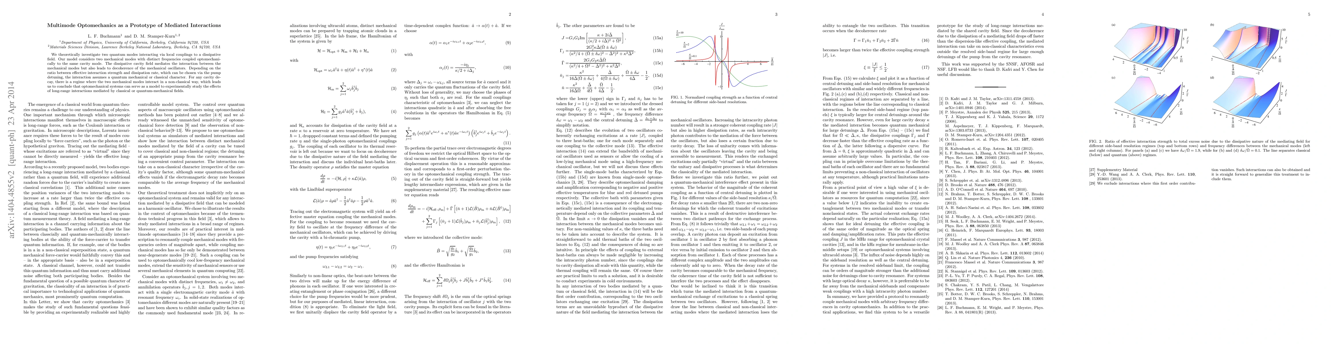 We theoretically investigate two quantum modes interacting via local couplings to a dissipative field. Our model considers two mechanical modes with distinct frequencies coupled optomechanically to the same cavity mode. The dissipative cavity field mediates the interaction between the mechanical modes but also leads to decoherence of the mechanical oscillators. Depending on the ratio between effective interaction strength and dissipation rate, which can be chosen via the pump detuning, the interaction assumes a quantum mechanical or classical character. For any cavity decay, there is a regime where the two mechanical modes interact in a non-classical way, which leads us to conclude that optomechanical systems can serve as a model to experimentally study the effects of long-range interactions mediated by classical or quantum-mechanical fields.
