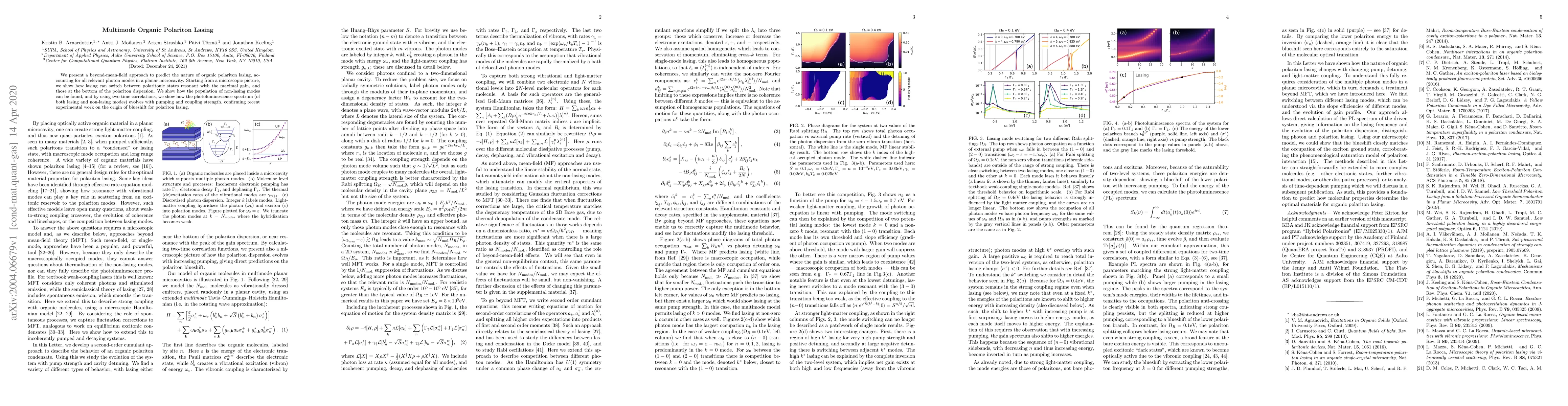 We present a beyond-mean-field approach to predict the nature of organic polariton lasing, accounting for all relevant photon modes in a planar microcavity. Starting from a microscopic picture, we show how lasing can switch between polaritonic states resonant with the maximal gain, and those at the bottom of the polariton dispersion. We show how the population of non-lasing modes can be found, and by using two-time correlations, we show how the photoluminescence spectrum (of both lasing and non-lasing modes) evolves with pumping and coupling strength, confirming recent experimental work on the origin of blueshift for polariton lasing.