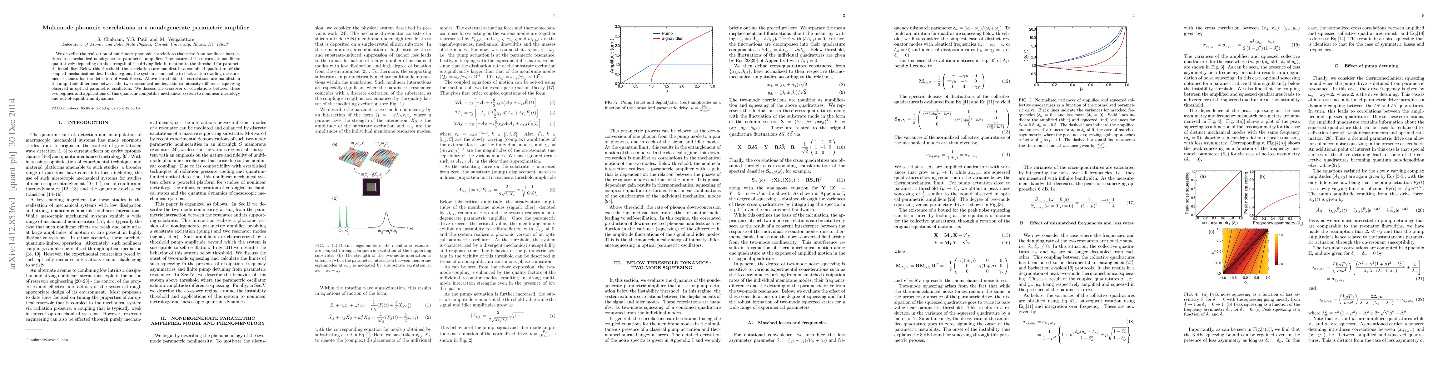 This paper investigates multimode phononic correlations in a mechanical nondegenerate parametric amplifier, showing how correlations change with driving field strength. Below the parametric instability threshold, correlations are seen in combined quadrature, enabling weak force detection. Above threshold, correlations manifest in amplitude differences, similar to optical intensity squeezing, and the paper discusses their transition and applications in nonlinear metrology and dynamics.