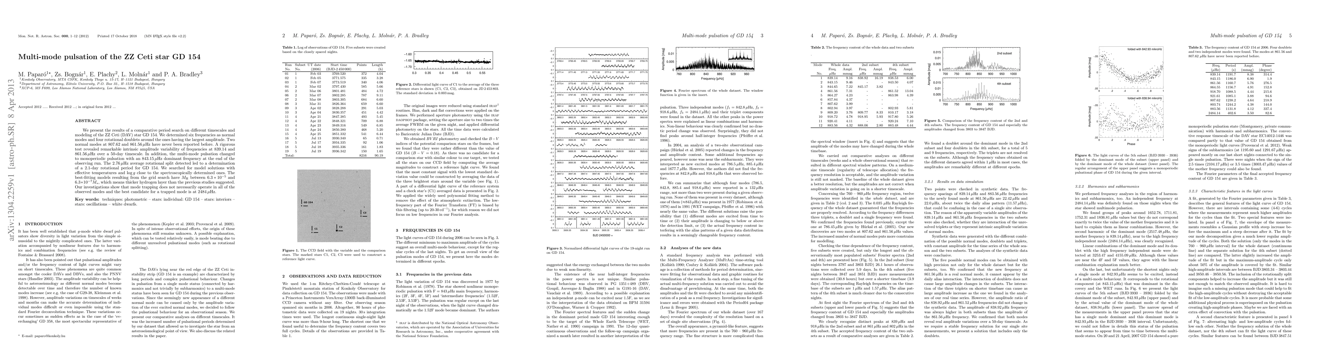 We present the results of a comparative period search on different time-scales and modelling of the ZZ Ceti (DAV) star GD 154. We determined six frequencies as normal modes and four rotational doublets around the ones having the largest amplitude. Two normal modes at 807.62 and 861.56 microHz have never been reported before. A rigorous test revealed remarkable intrinsic amplitude variability of frequencies at 839.14 and 861.56 microHz over a 50 d time-scale. In addition, the multimode pulsation changed to monoperiodic pulsation with an 843.15 microHz dominant frequency at the end of the observing run. The 2.76 microHz average rotational split detected led to a determination of a 2.1 d rotational period for GD 154. We searched for model solutions with effective temperatures and log g close to the spectroscopically determined ones. The best-fitting models resulting from the grid search have M_H between 6.3 x 10^-5 and 6.3 x 10^-7 M*, which means thicker hydrogen layer than the previous studies suggested. Our investigations show that mode trapping does not necessarily operate in all of the observed modes and the best candidate for a trapped mode is at 2484 microHz.