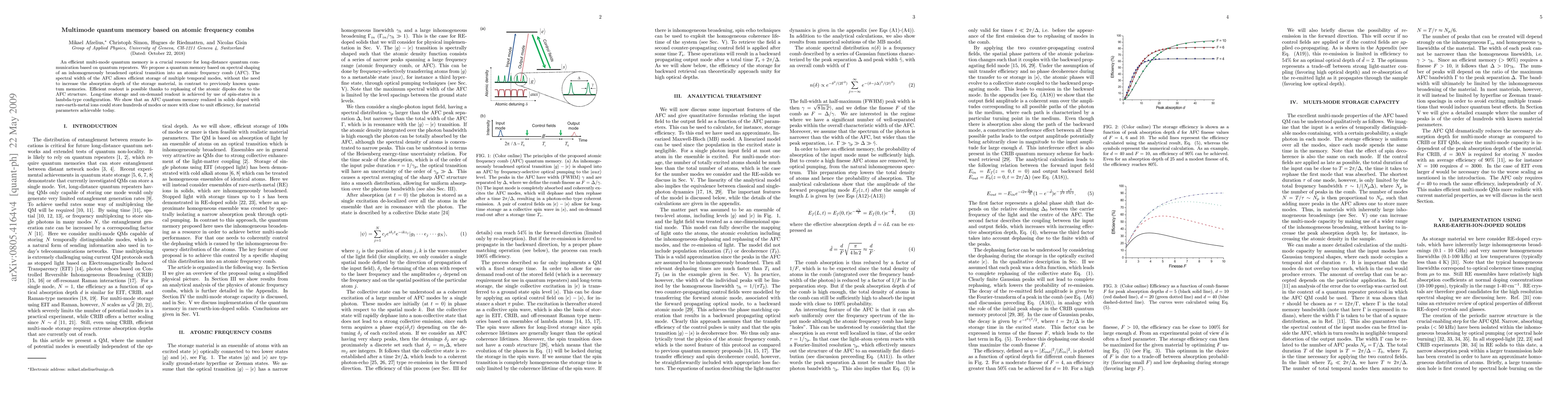 This paper proposes a multi-mode quantum memory based on atomic frequency combs (AFC) for long-distance quantum communication. It demonstrates efficient storage and retrieval of multiple temporal modes without increasing absorption depth, utilizing spin-states in a lambda-type configuration for long-time storage.