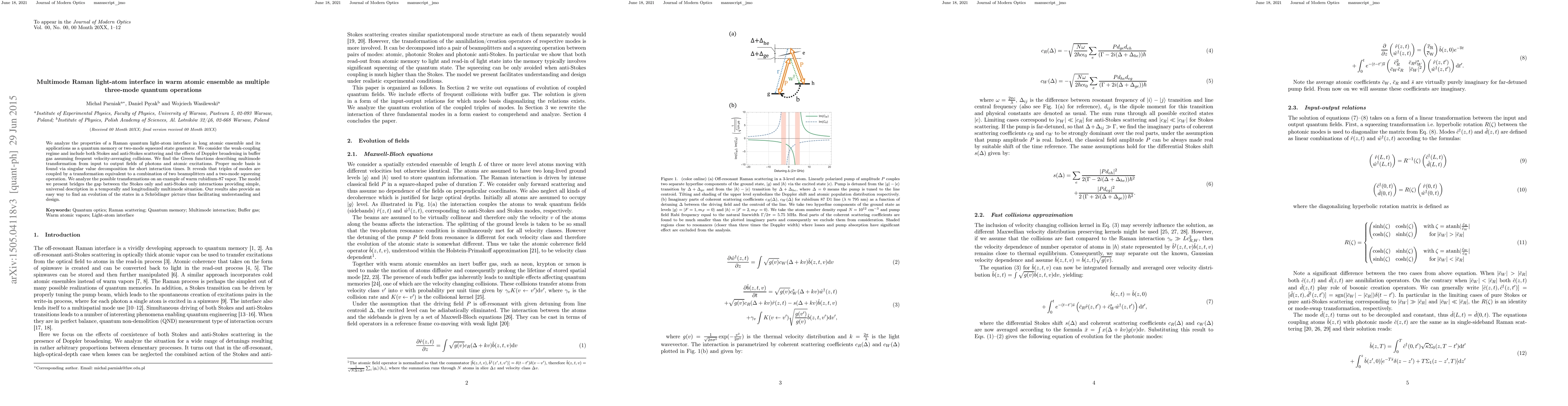 This paper investigates a Raman quantum light-atom interface in warm atomic ensembles, demonstrating its utility for quantum memory and squeezed state generation. It provides a universal description of multimode transformations via a combination of beamsplitters and squeezing operations, simplifying the analysis of interactions in a warm rubidium-87 vapor.