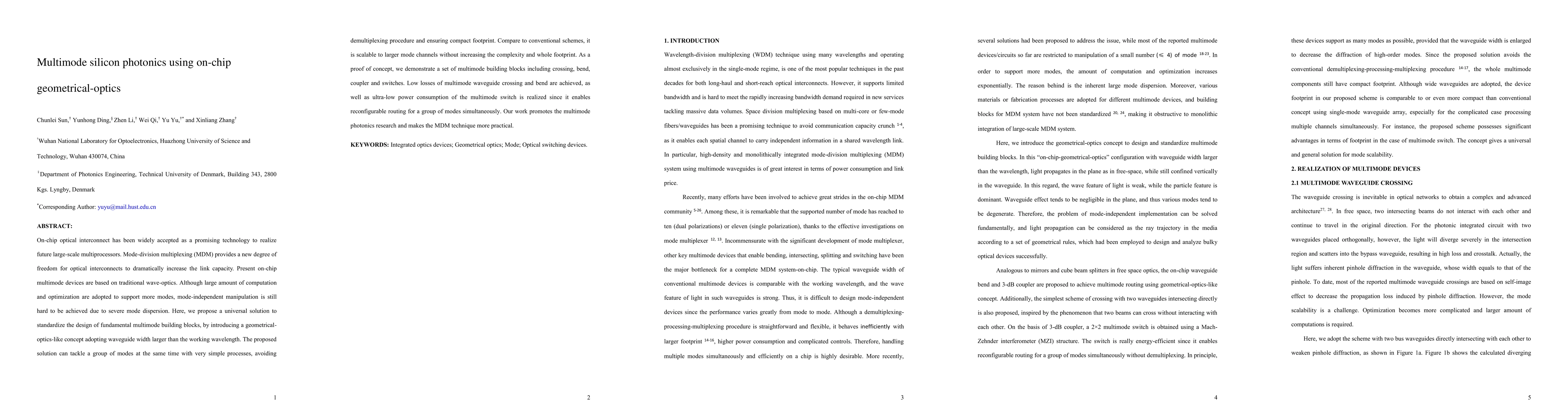 This paper proposes a novel geometrical-optics-based approach for on-chip multimode silicon photonics to tackle mode dispersion issues, enabling scalable and compact multimode interconnects without demultiplexing. The method demonstrates low-loss waveguide crossings and bends, and ultra-low power multimode switches, advancing the practical application of mode-division multiplexing.