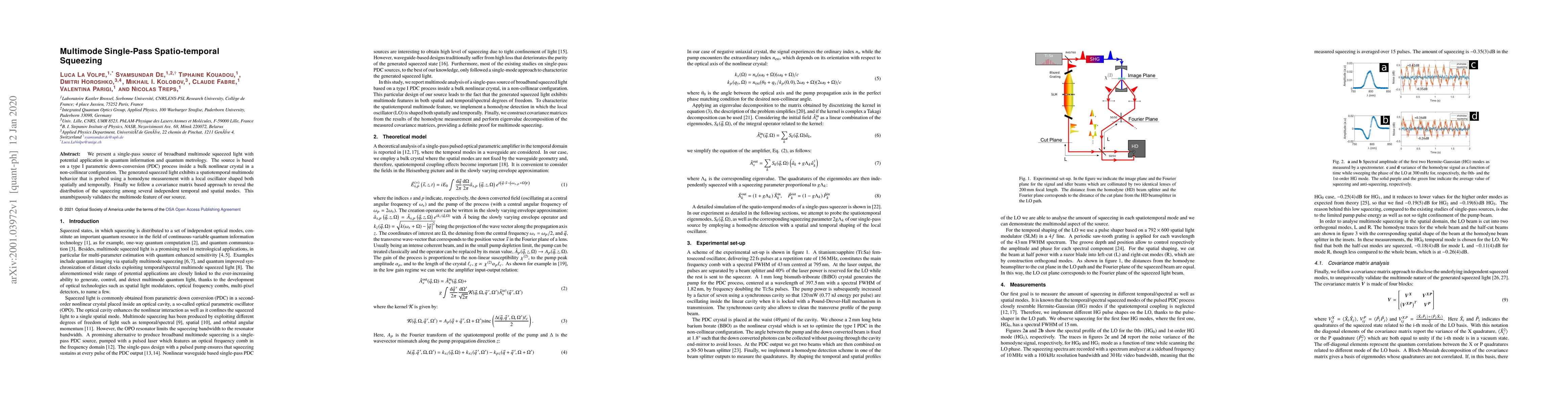 This paper introduces a single-pass source of broadband multimode squeezed light via non-collinear type I parametric down-conversion, demonstrating its potential in quantum information and metrology. The spatiotemporal squeezing is validated through homodyne measurements and a covariance matrix analysis, confirming the multimode nature of the generated light.