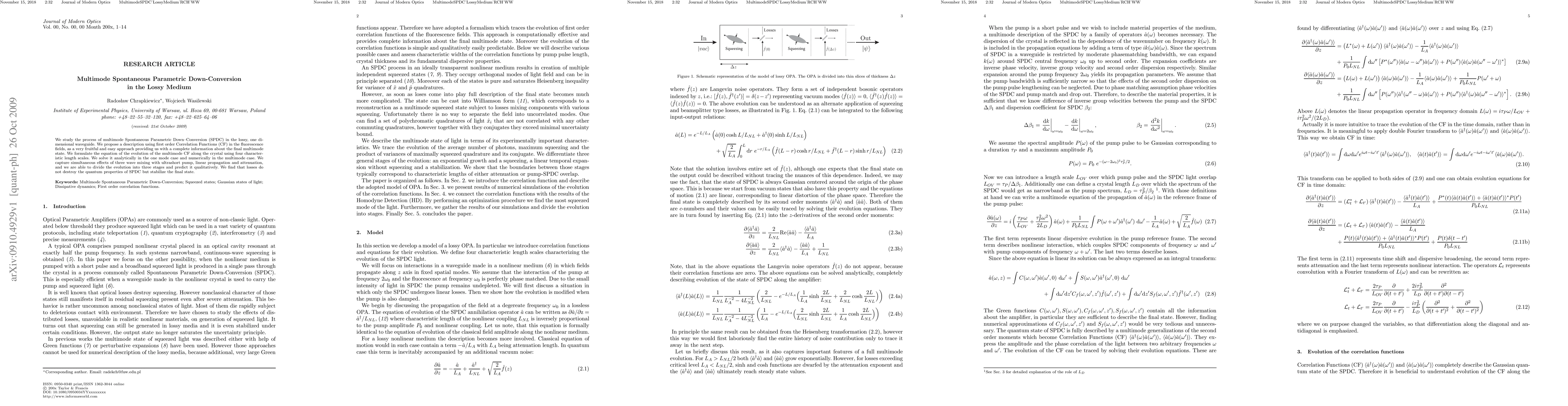 We study the process of multimode Spontaneous Parametric Down--Conversion (SPDC) in the lossy, one dimensional waveguide. We propose a description using first order Correlation Functions (CF) in the fluorescence fields, as a very fruitful and easy approach providing us with a complete information about the final multimode state. We formulate the equation of the evolution of the multimode CF along the crystal using four characteristic length scales. We solve it analytically in the one mode case and numerically in the multimode case. We capture simultaneous effects of three wave mixing with ultrashort pump, linear propagation and attenuation, and we are able to divide the evolution into three stages and predict it qualitatively. We find that losses do not destroy the quantum properties of SPDC but stabilize the final state.