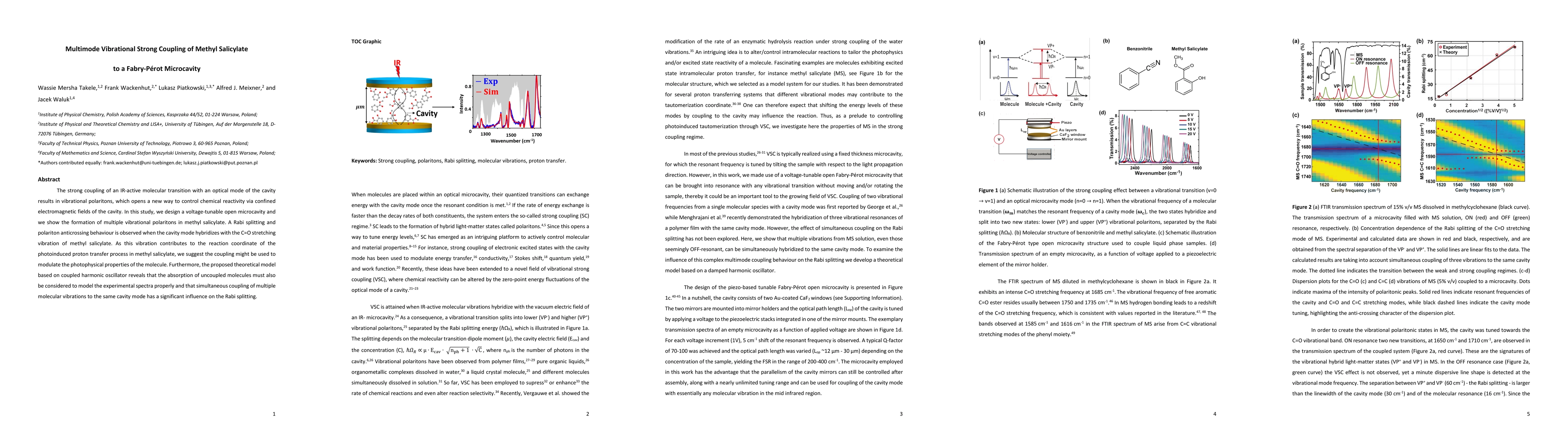 This study demonstrates the strong coupling of methyl salicylate's IR-active molecular transition with a Fabry-Pérot microcavity, resulting in the formation of vibrational polaritons. The coupling potentially modulates the molecule's photophysical properties, with implications for controlling chemical reactivity.