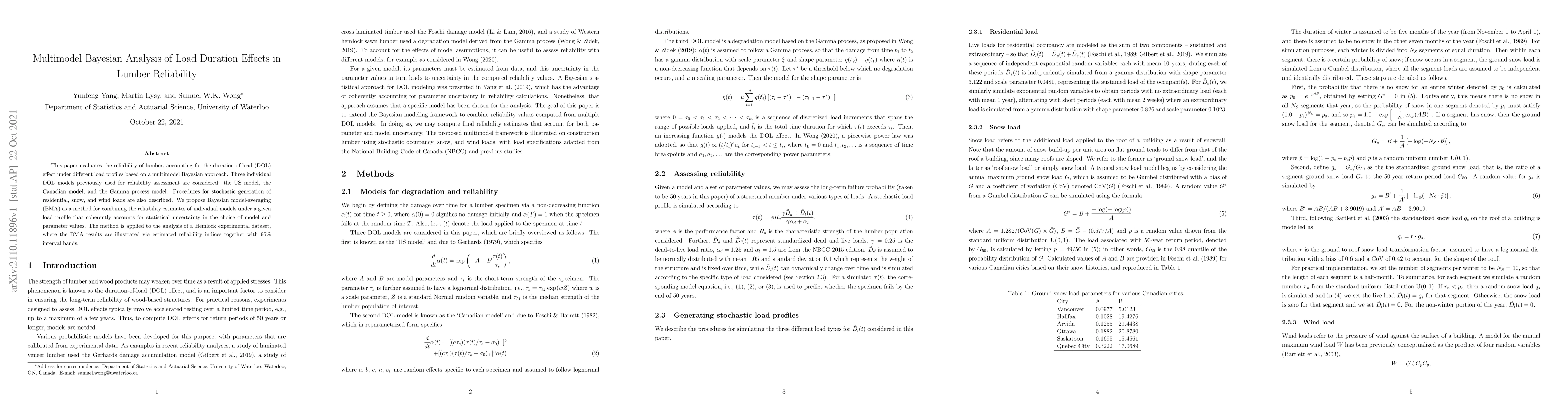 This paper evaluates the reliability of lumber, accounting for the duration-of-load (DOL) effect under different load profiles based on a multimodel Bayesian approach. Three individual DOL models previously used for reliability assessment are considered: the US model, the Canadian model, and the Gamma process model. Procedures for stochastic generation of residential, snow, and wind loads are also described. We propose Bayesian model-averaging (BMA) as a method for combining the reliability estimates of individual models under a given load profile that coherently accounts for statistical uncertainty in the choice of model and parameter values. The method is applied to the analysis of a Hemlock experimental dataset, where the BMA results are illustrated via estimated reliability indices together with 95% interval bands.