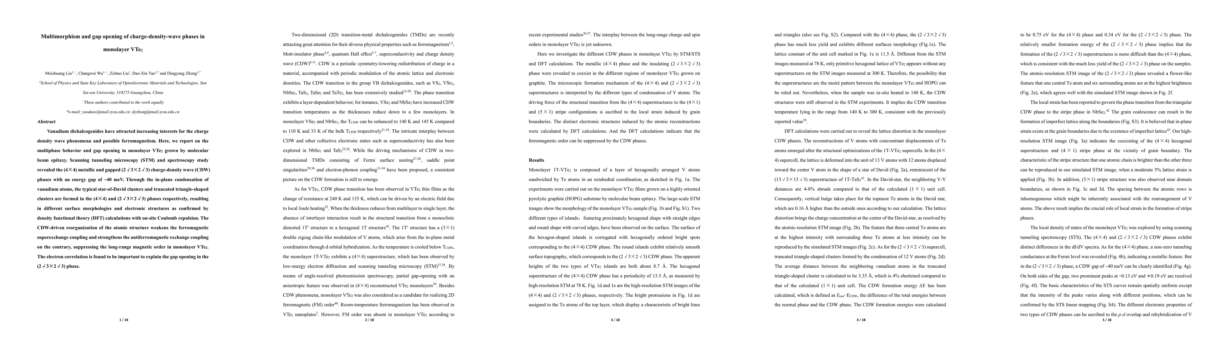 Vanadium dichalcogenides have attracted increasing interests for the charge density wave phenomena and possible ferromagnetism. Here, we report on the multiphase behavior and gap opening in monolayer VTe2 grown by molecular beam epitaxy. Scanning tunneling microscopy and spectroscopy study revealed the (4*4) metallic and gapped (2root3*2root3)charge-density wave pahses with an energy gap of ~40 meV. Through the in-plane condensation of vanadium atoms, the typical star-of-David clusters and truncated triangle-shaped clusters are formed in (4*4) and (2root3*2root3) phases respectively, resulting in different surface morphologies and electronic structures as confirmed by density functional theory calculations with on-site coulomb repulsion. The CDW-driven reorganization of the atomic structure weakens the ferromagnetic superexchange coupling and strengthens the antiferromagnetic exchange coupling on the contrary, suppressing the long-range magnetic order in monolayer VTe2.