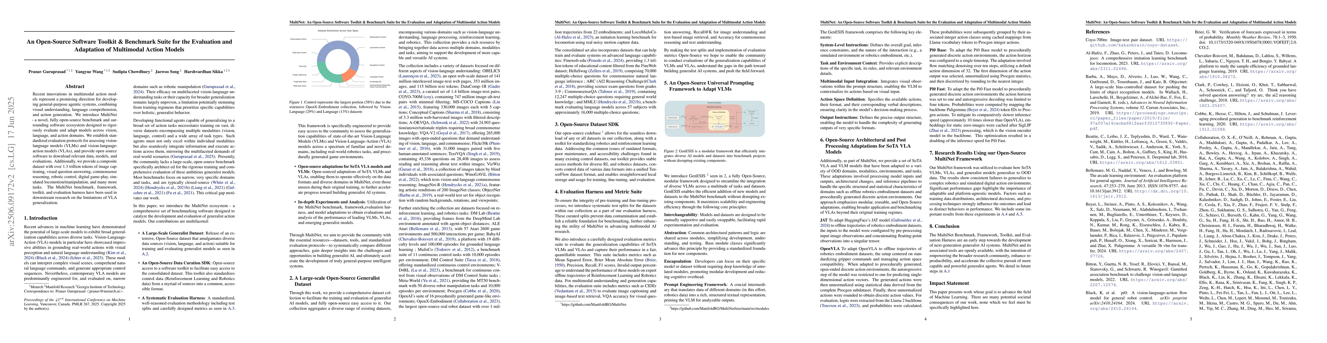 MultiNet is an open-source toolkit and benchmark suite that evaluates and adapts multimodal action models for vision, language, and action domains. It provides a standardized framework and dataset to assess model performance across various tasks.