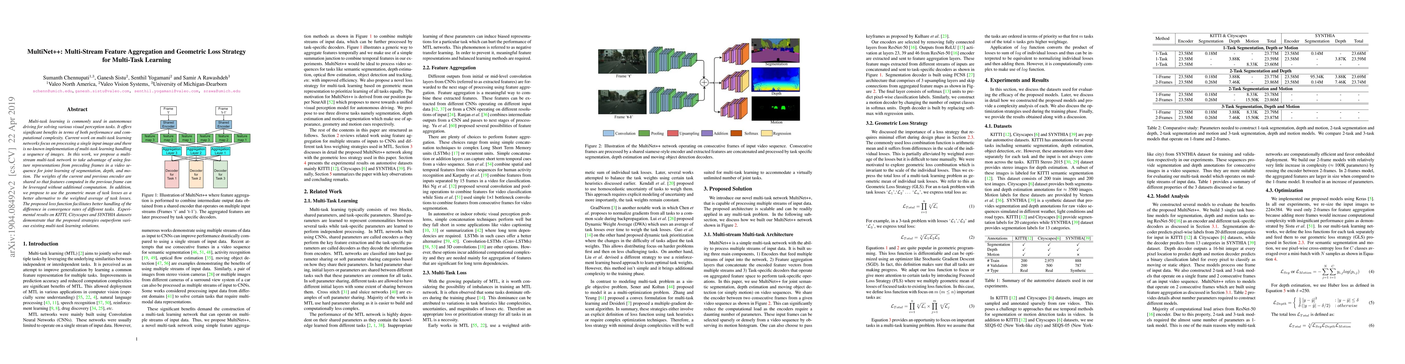 Multi-task learning is commonly used in autonomous driving for solving various visual perception tasks. It offers significant benefits in terms of both performance and computational complexity. Current work on multi-task learning networks focus on processing a single input image and there is no known implementation of multi-task learning handling a sequence of images. In this work, we propose a multi-stream multi-task network to take advantage of using feature representations from preceding frames in a video sequence for joint learning of segmentation, depth, and motion. The weights of the current and previous encoder are shared so that features computed in the previous frame can be leveraged without additional computation. In addition, we propose to use the geometric mean of task losses as a better alternative to the weighted average of task losses. The proposed loss function facilitates better handling of the difference in convergence rates of different tasks. Experimental results on KITTI, Cityscapes and SYNTHIA datasets demonstrate that the proposed strategies outperform various existing multi-task learning solutions.