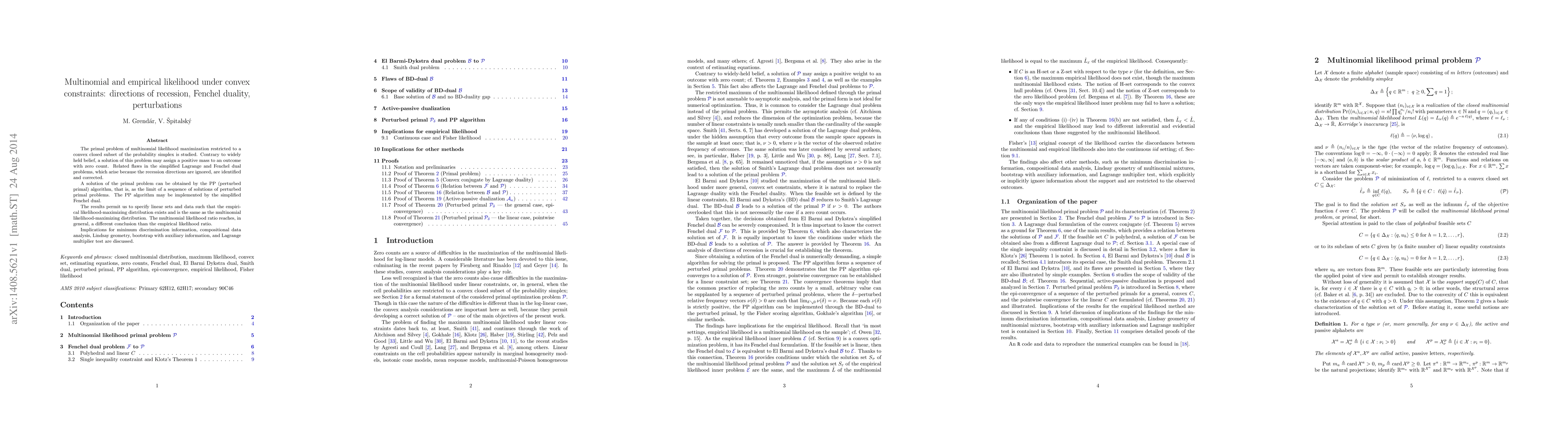 The primal problem of multinomial likelihood maximization restricted to a convex closed subset of the probability simplex is studied. Contrary to widely held belief, a solution of this problem may assign a positive mass to an outcome with zero count. Related flaws in the simplified Lagrange and Fenchel dual problems, which arise because the recession directions are ignored, are identified and corrected. A solution of the primal problem can be obtained by the PP (perturbed primal) algorithm, that is, as the limit of a sequence of solutions of perturbed primal problems. The PP algorithm may be implemented by the simplified Fenchel dual. The results permit us to specify linear sets and data such that the empirical likelihood-maximizing distribution exists and is the same as the multinomial likelihood-maximizing distribution. The multinomial likelihood ratio reaches, in general, a different conclusion than the empirical likelihood ratio. Implications for minimum discrimination information, compositional data analysis, Lindsay geometry, bootstrap with auxiliary information, and Lagrange multiplier tests are discussed.