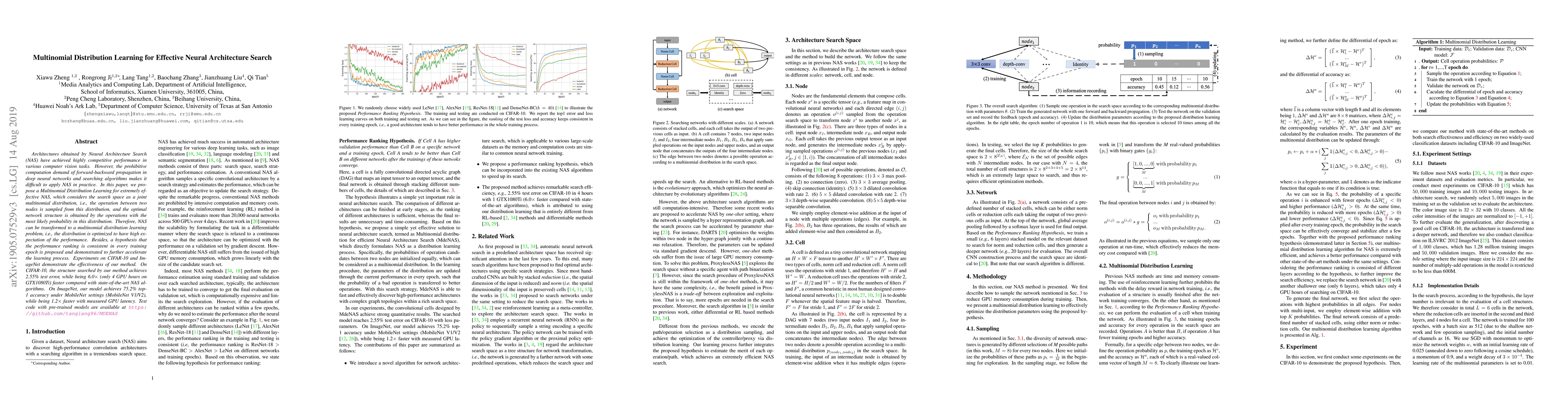 Architectures obtained by Neural Architecture Search (NAS) have achieved highly competitive performance in various computer vision tasks. However, the prohibitive computation demand of forward-backward propagation in deep neural networks and searching algorithms makes it difficult to apply NAS in practice. In this paper, we propose a Multinomial Distribution Learning for extremely effective NAS,which considers the search space as a joint multinomial distribution, i.e., the operation between two nodes is sampled from this distribution, and the optimal network structure is obtained by the operations with the most likely probability in this distribution. Therefore, NAS can be transformed to a multinomial distribution learning problem, i.e., the distribution is optimized to have a high expectation of the performance. Besides, a hypothesis that the performance ranking is consistent in every training epoch is proposed and demonstrated to further accelerate the learning process. Experiments on CIFAR10 and ImageNet demonstrate the effectiveness of our method. On CIFAR-10, the structure searched by our method achieves 2.55% test error, while being 6.0x (only 4 GPU hours on GTX1080Ti) faster compared with state-of-the-art NAS algorithms. On ImageNet, our model achieves 75.2% top1 accuracy under MobileNet settings (MobileNet V1/V2), while being 1.2x faster with measured GPU latency. Test code with pre-trained models are available at https://github.com/tanglang96/MDENAS