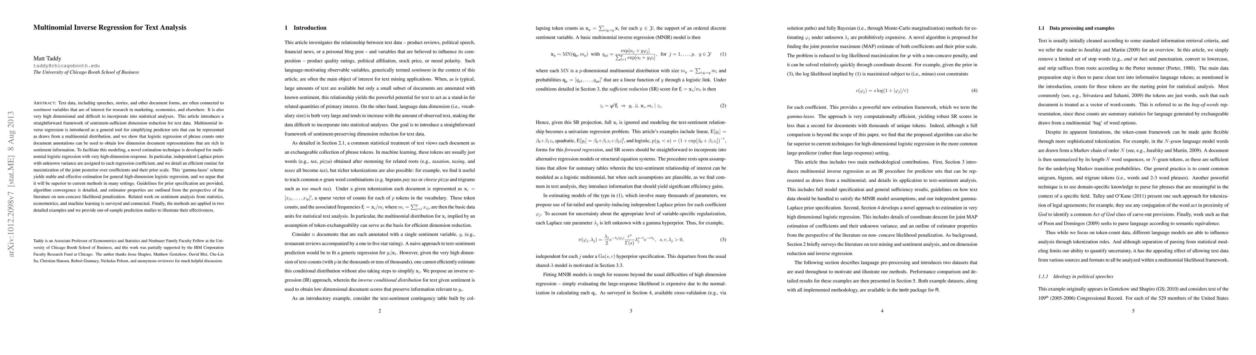 This paper introduces multinomial inverse regression for text analysis, offering a framework for reducing high-dimensional text data while preserving sentiment information. It proposes a novel "gamma-lasso" estimation technique for multinomial logistic regression, which uses independent Laplace priors to stabilize high-dimensional coefficient estimation, and demonstrates its effectiveness through detailed examples and out-of-sample predictions.