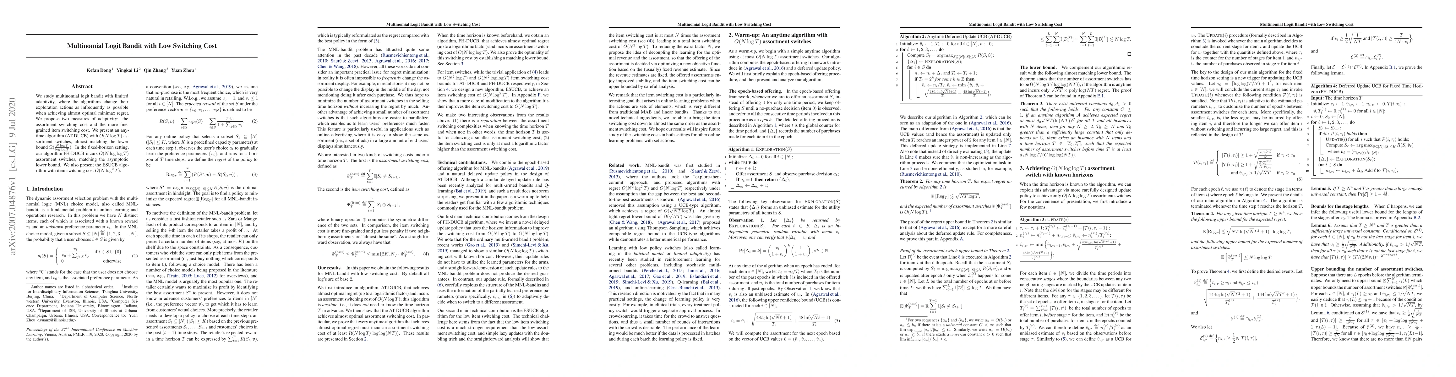 The paper studies the multinomial logit bandit problem with limited adaptivity, focusing on minimizing regret by reducing the frequency of action (assortment) changes. It introduces two measures of adaptivity: assortment switching cost and item switching cost.