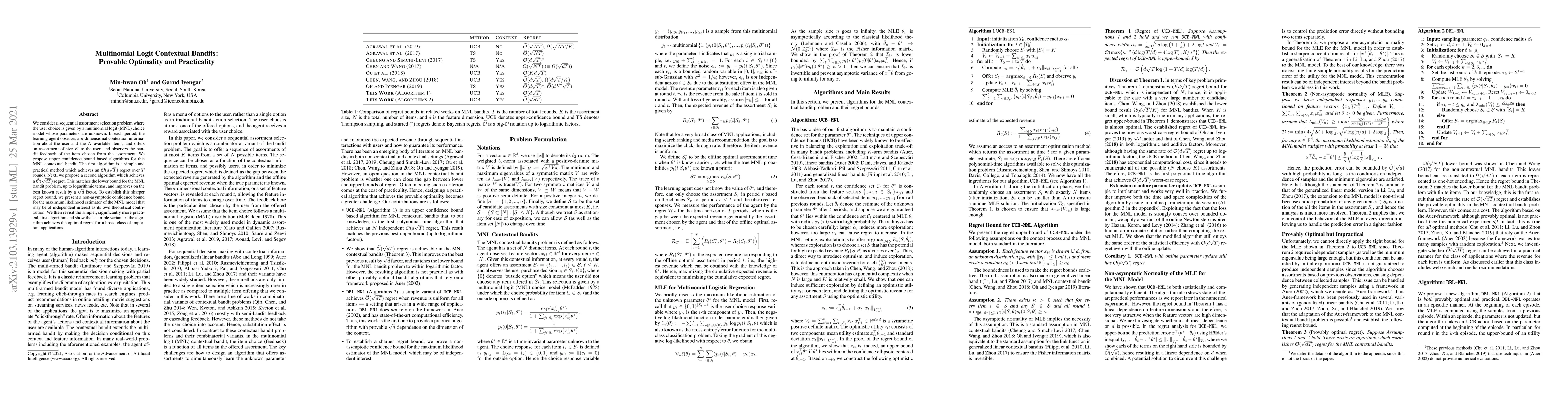 This paper proposes algorithms for multinomial logit contextual bandits, achieving optimal regret bounds with practical efficiency. The first algorithm offers a $\tilde{\mathcal{O}}(d\sqrt{T})$ regret, while the second achieves $\tilde{\mathcal{O}}(\sqrt{dT})$ regret, improving previous results by a $\sqrt{d}$ factor.