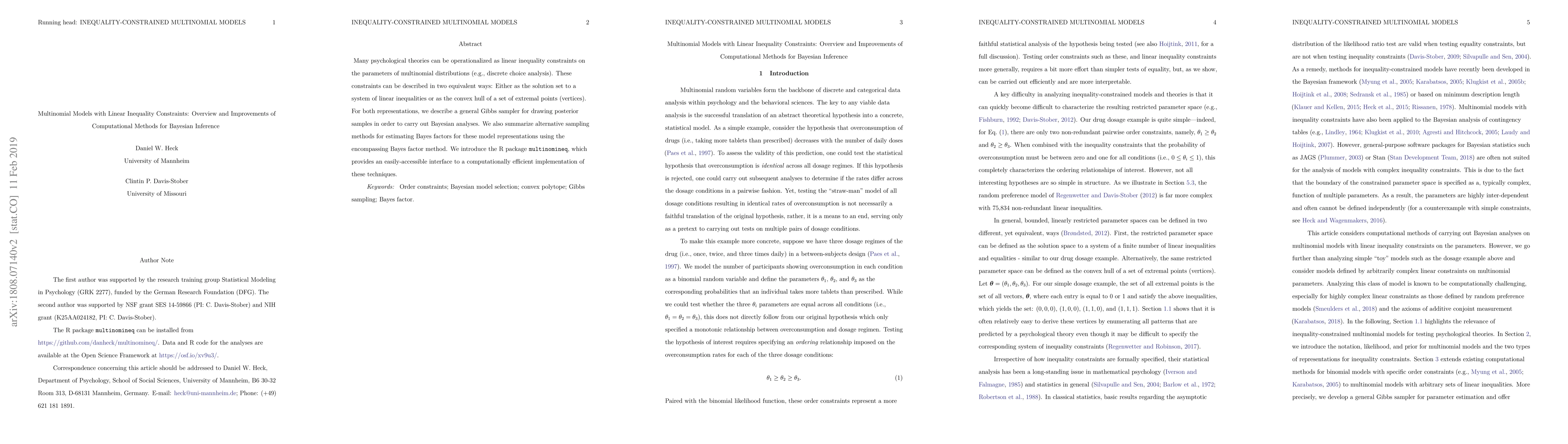 This paper presents a general Gibbs sampler for Bayesian inference in multinomial models with linear inequality constraints, alongside alternative sampling methods for estimating Bayes factors. It introduces the R package multinomineq for efficient implementation of these techniques.